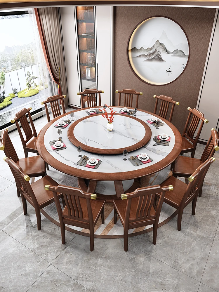新中式スタイルのラウンドテーブル - 1.8メートルの全無垢材と大理石仕上げ、10人用の広々としたダイニングテーブル。高級感溢れるデザインで、家族や友人との特別なひとときを演出します。