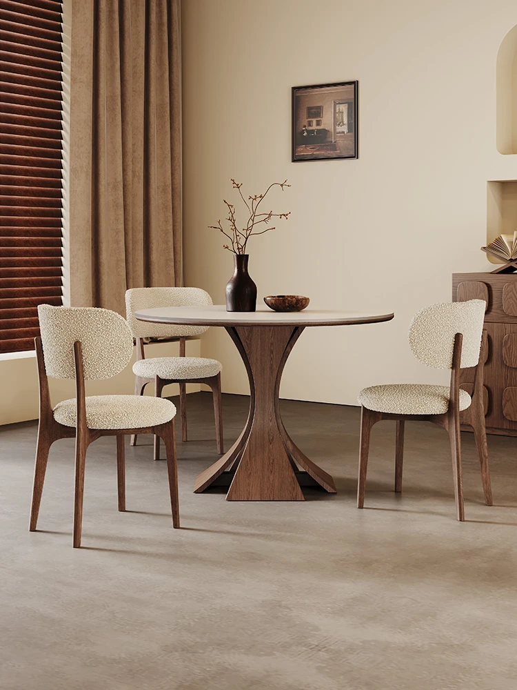 北欧スタイルの無垢材ダイニングテーブル - モダンでシンプルな丸型、ウォールナット色、イタリアン・ワビサビデザイン、マットな質感のストーントップ。優雅な食空間を演出します!