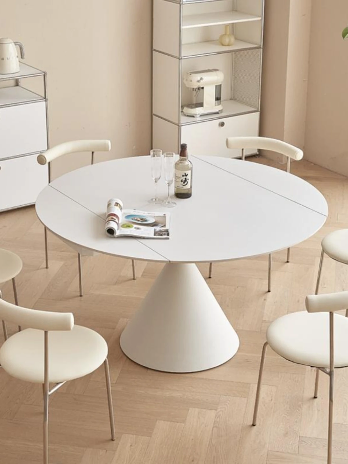 クリーミーなホワイトの岩板ダイニングテーブル&チェアセット、回転式&伸縮可能!小さなスペースにもぴったりの折りたたみ式、四角と丸の両方で使える便利なデザイン。家庭用に最適!
