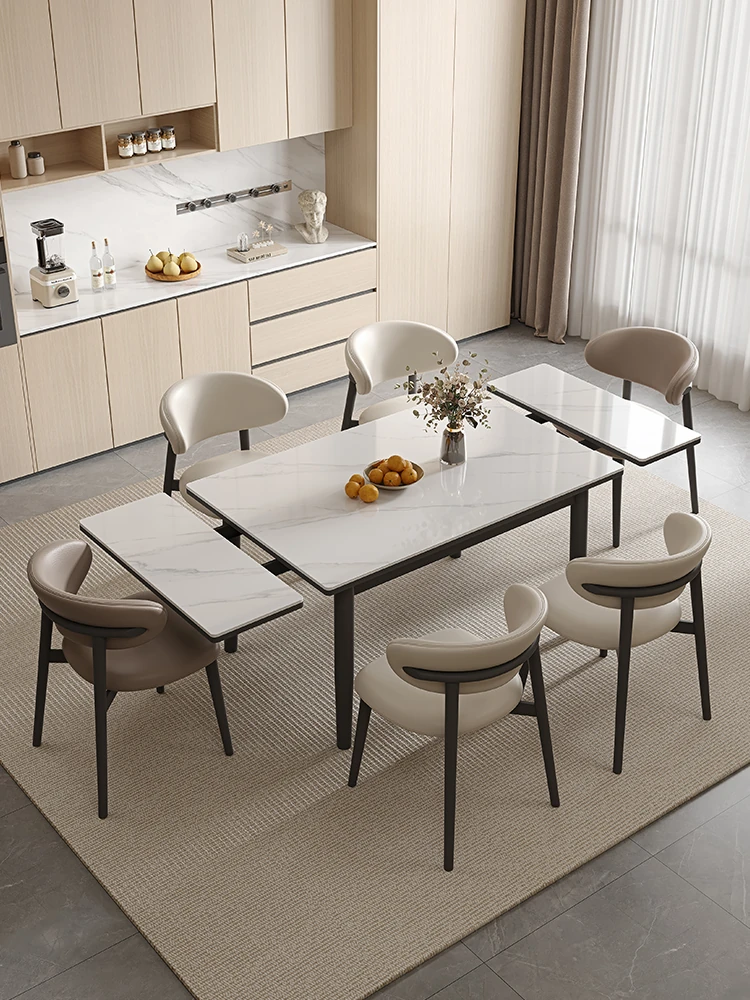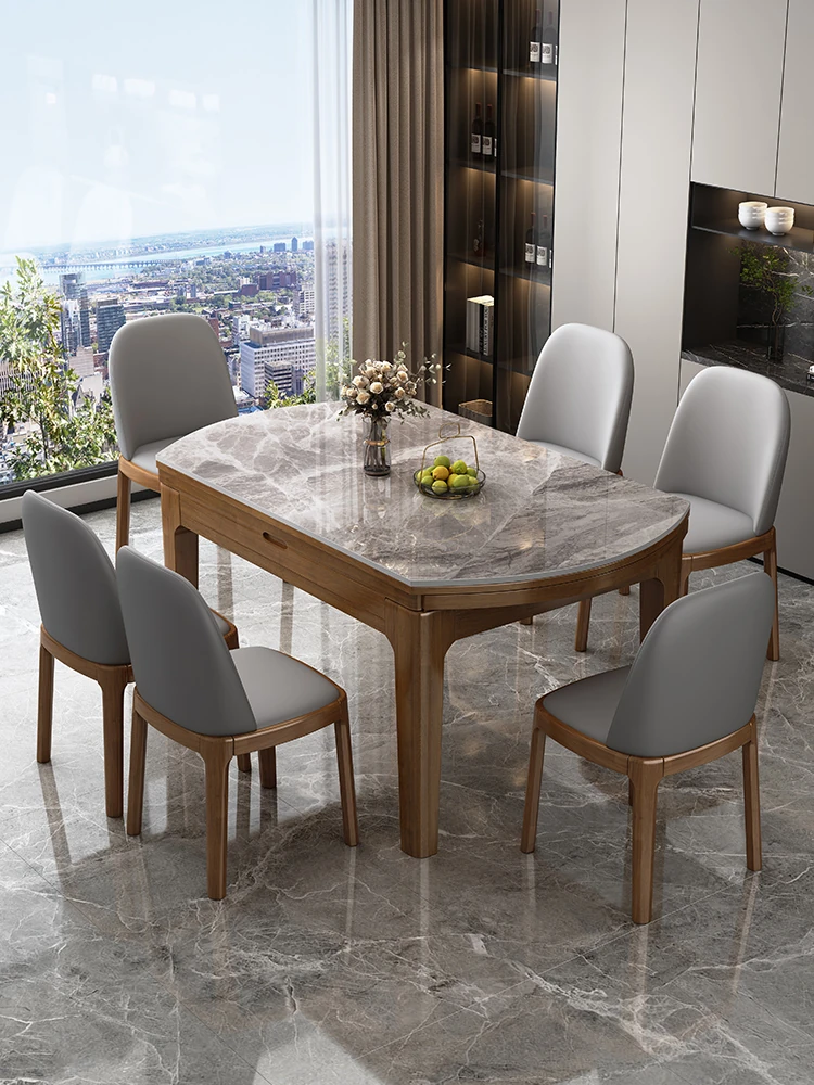 現代的でシンプルなデザインの岩板ダイニングテーブル&チェアセット。小スペースに最適な軽やかなラグジュアリー感!多機能で伸縮可能な丸型天然木製テーブルで、家族や友人との食事をより特別な時間に。