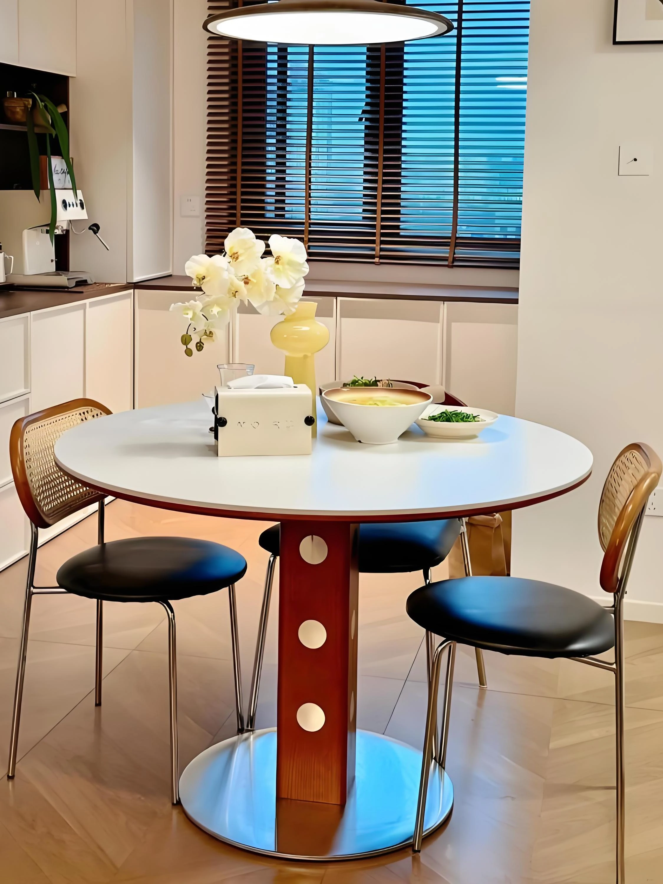 レトロな北欧デザインの日本式岩板円卓 - 小スペースにもぴったりな実木製ダイニングテーブル。魅力的なチューリップデザインで、軽やかなラグジュアリー感を演出。おしゃれな食卓を実現します!