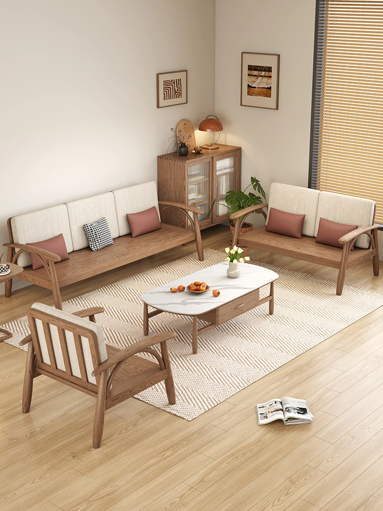 Solid Wood Sofa - Modern Minimalist Three-Seat Couch for Small Living Rooms, Made of Ash Wood, Nordic Style Furniture Set