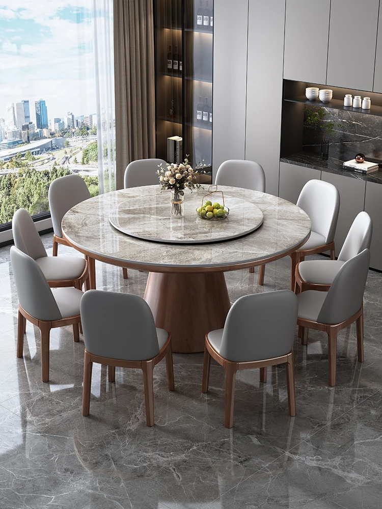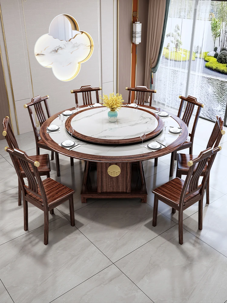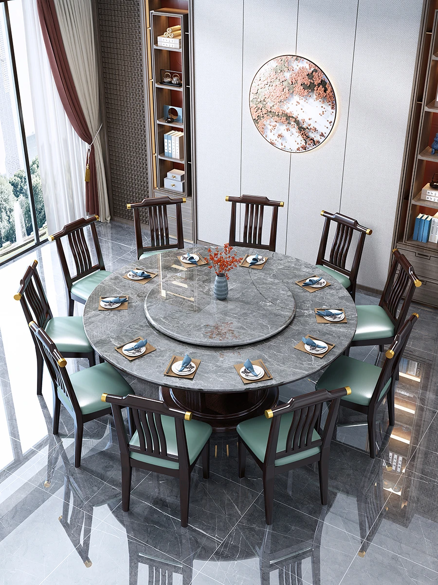 Elegant Round Dining Table - New Chinese Style Solid Wood and Marble Design for Restaurants and Homes, Accommodates 10 People, 1.8m Diameter