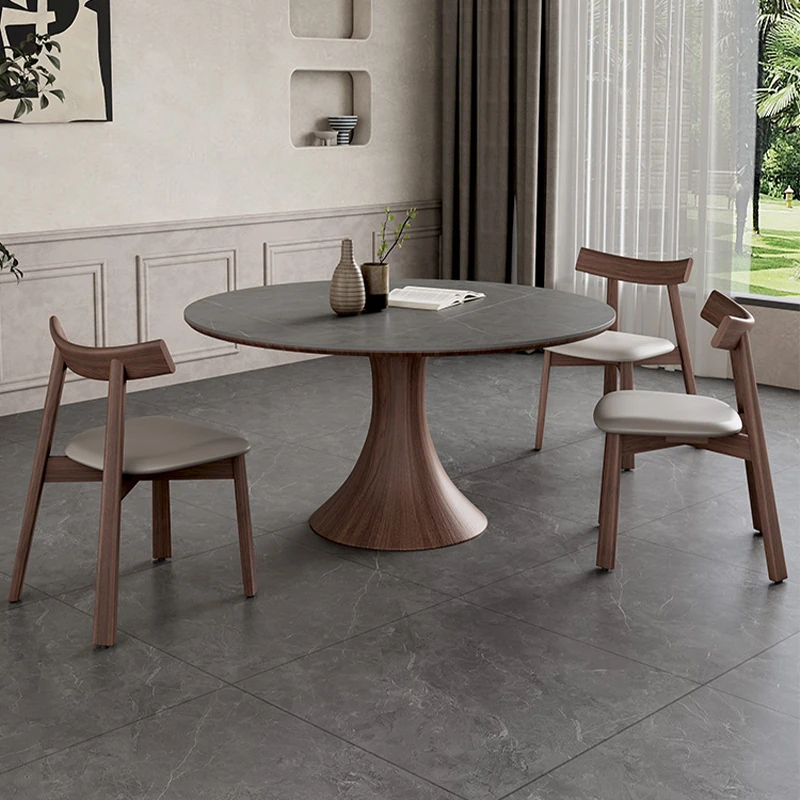 Modern Scandinavian Round Solid Wood Dining Table with Walnut Finish - Minimalist Wabi-Sabi Style Matte Stone Top - Perfect for Stylish Dining Spaces