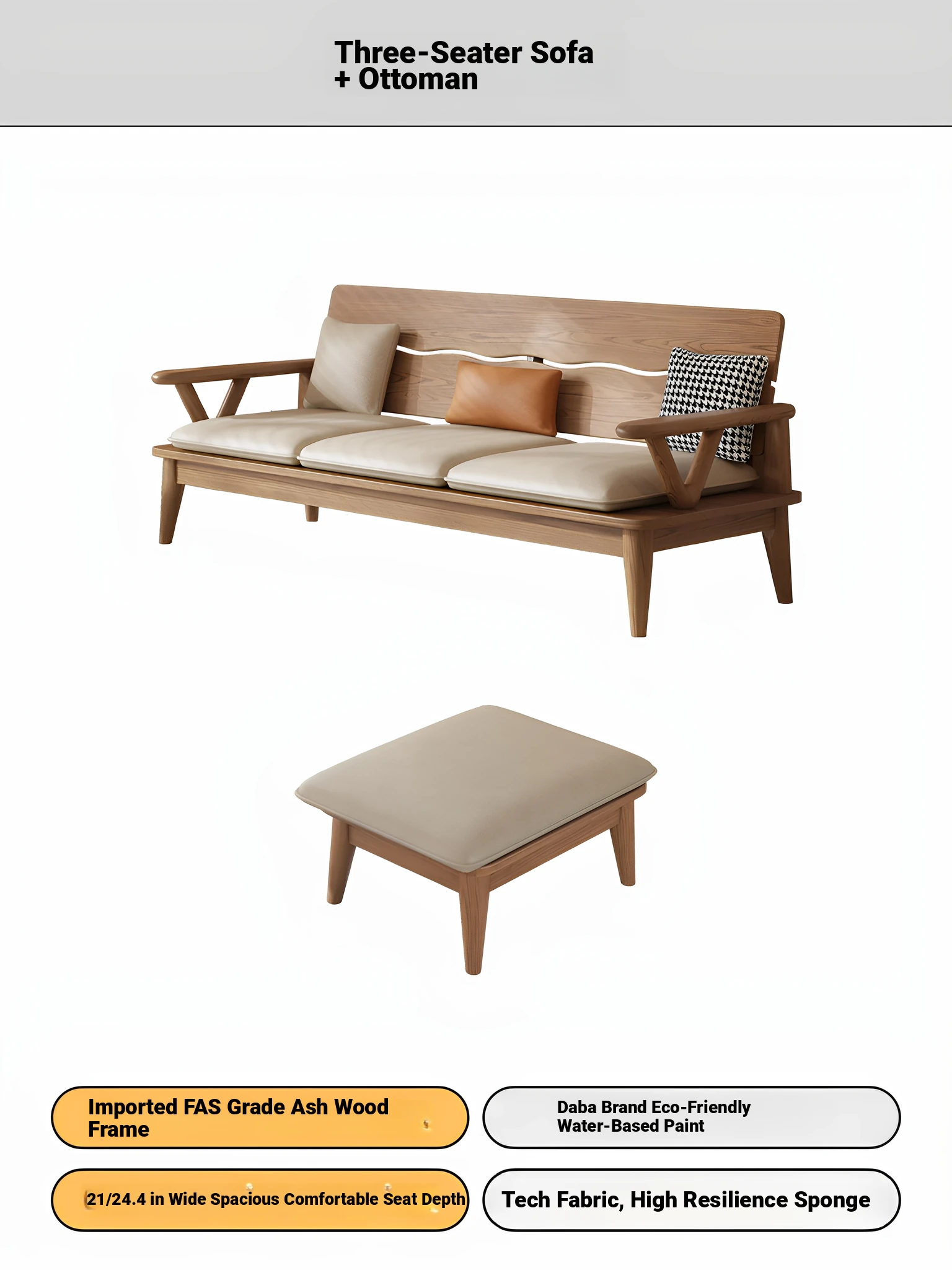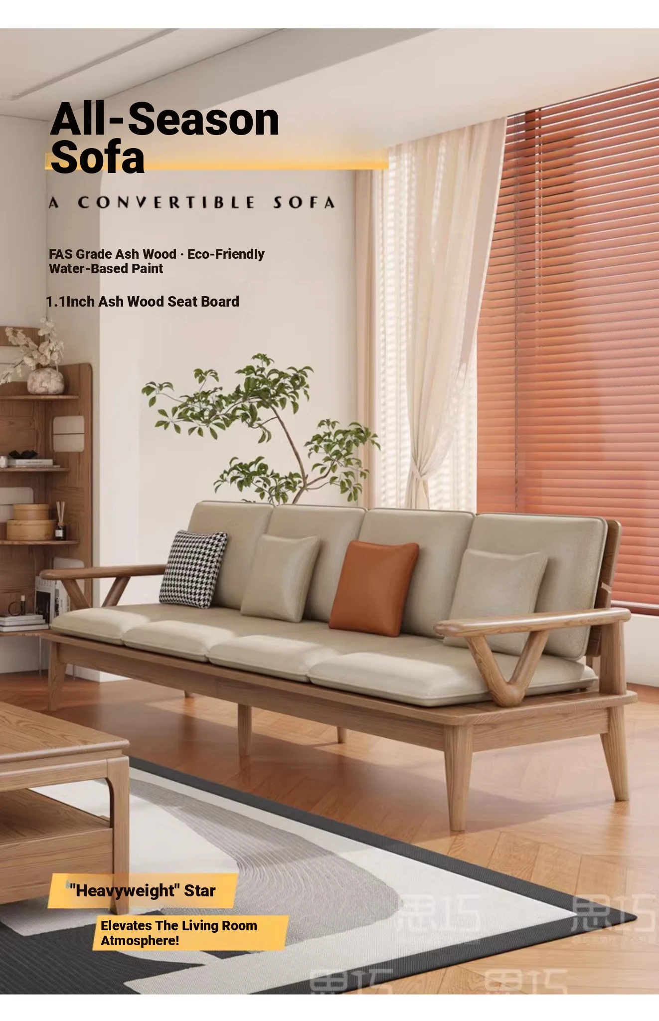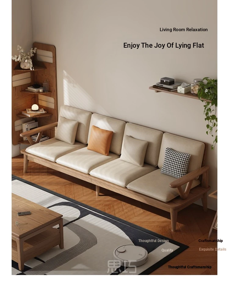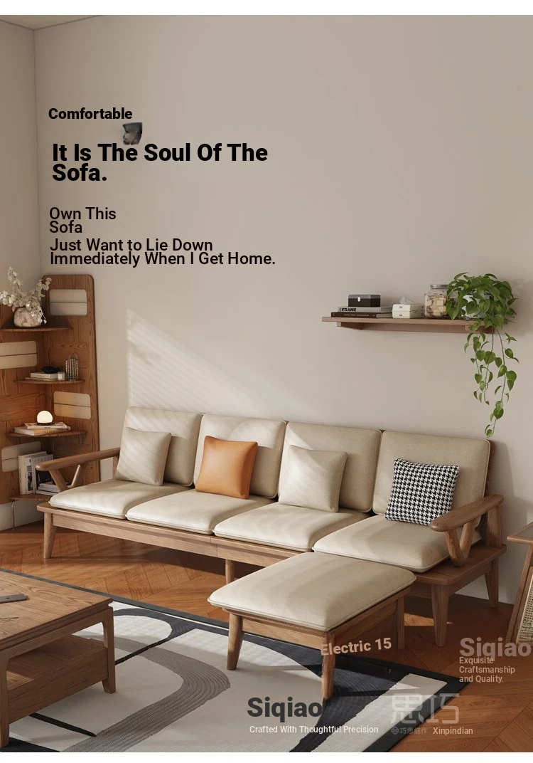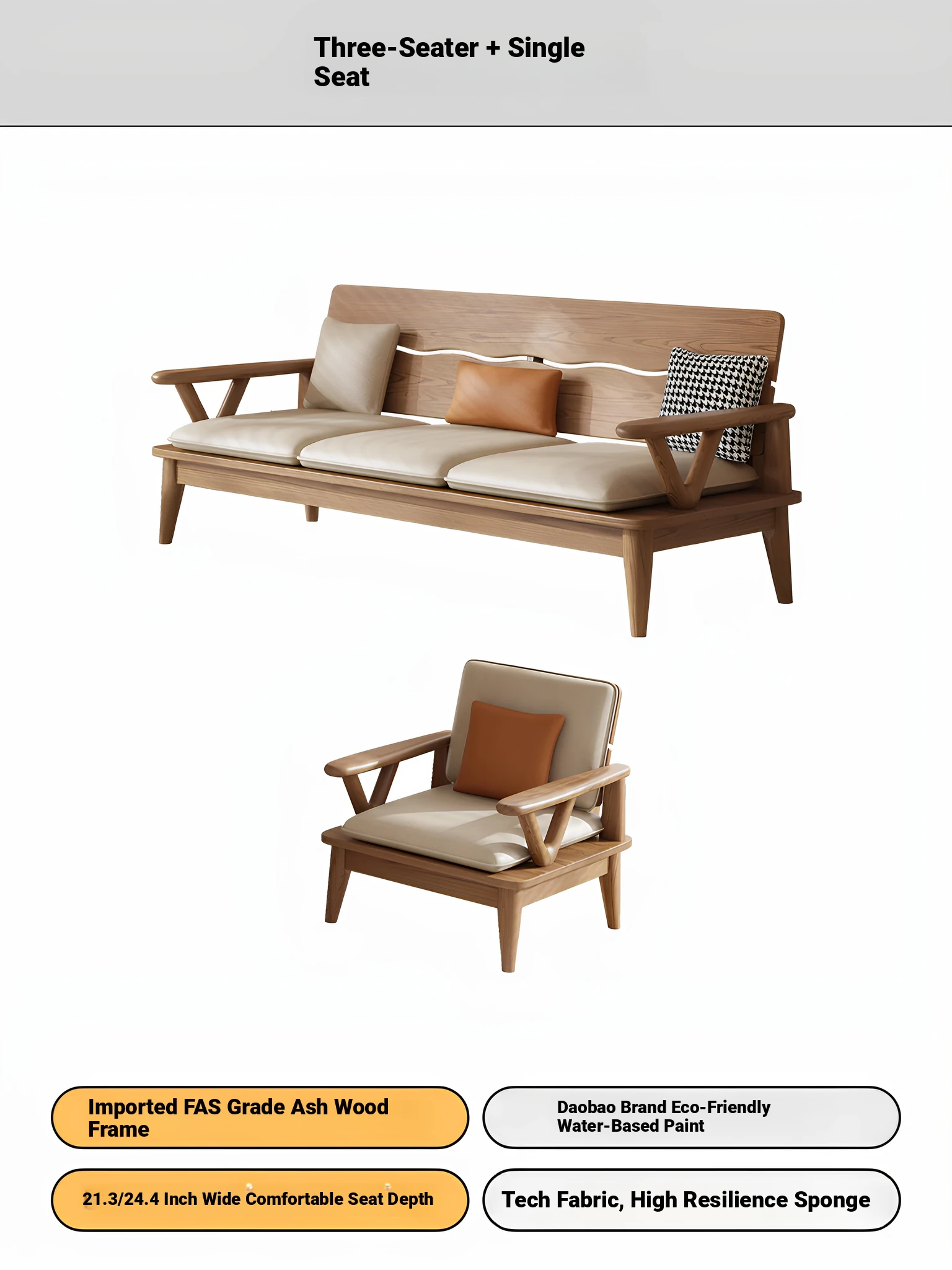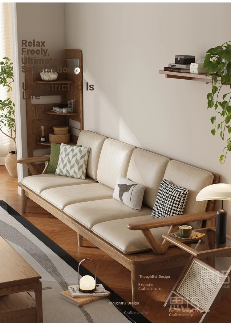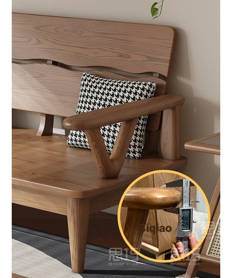 Modern Minimalist Solid Wood Sofa - New Chinese Style for Small Living Rooms, Available in 3-Seater and 4-Seater, Made of Natural Ash Wood for a Chic and Elegant Look.