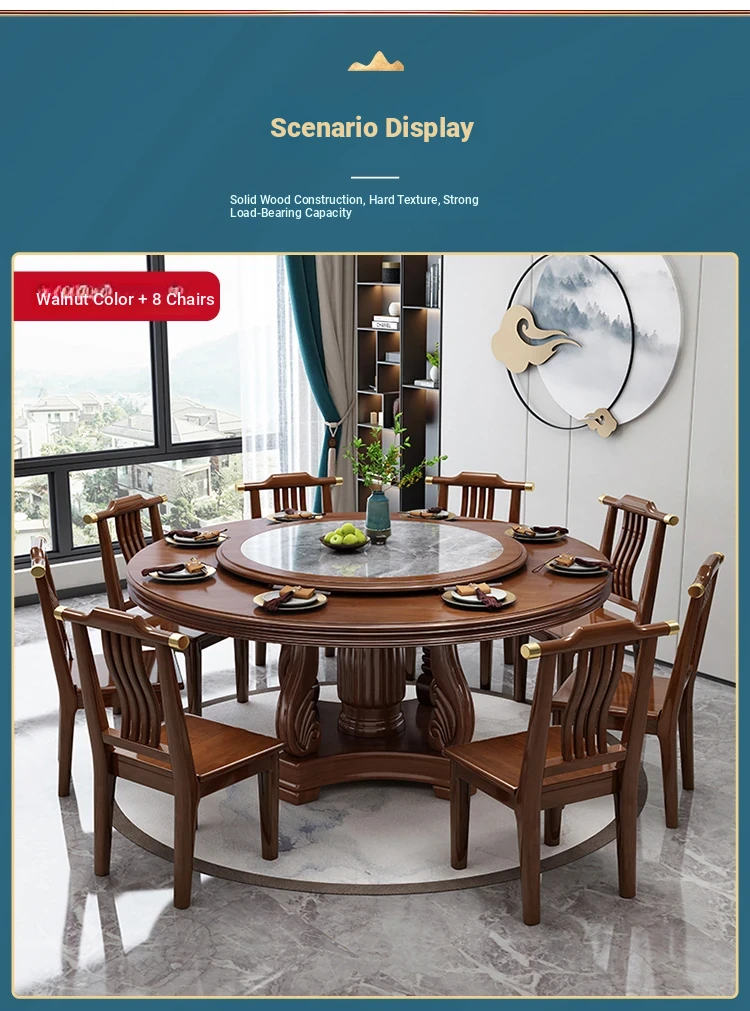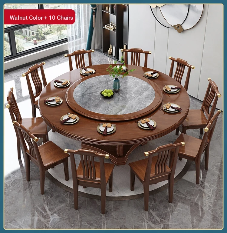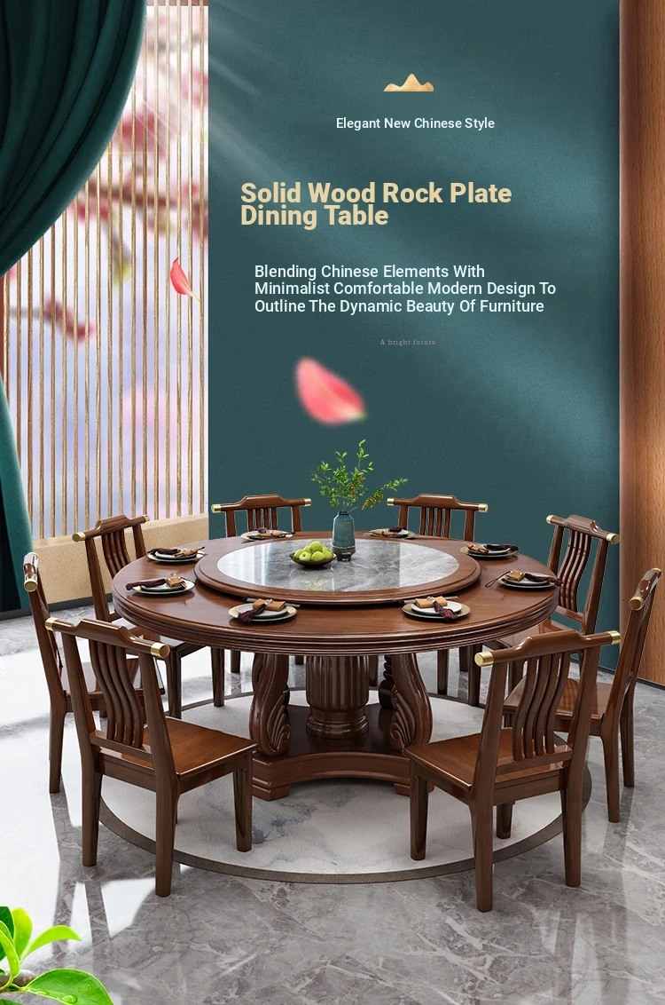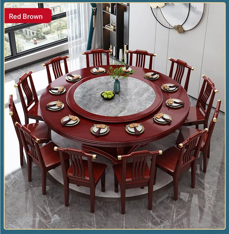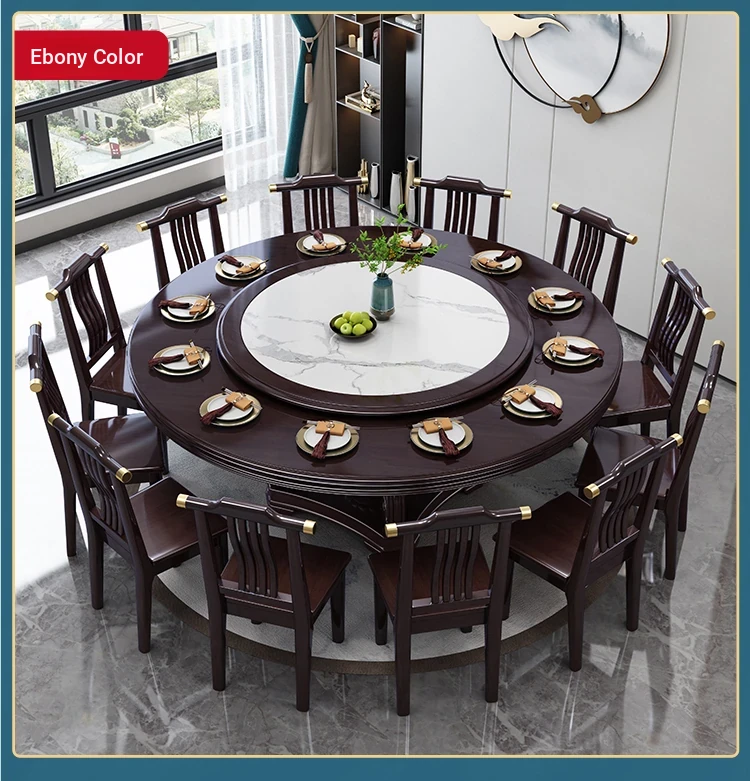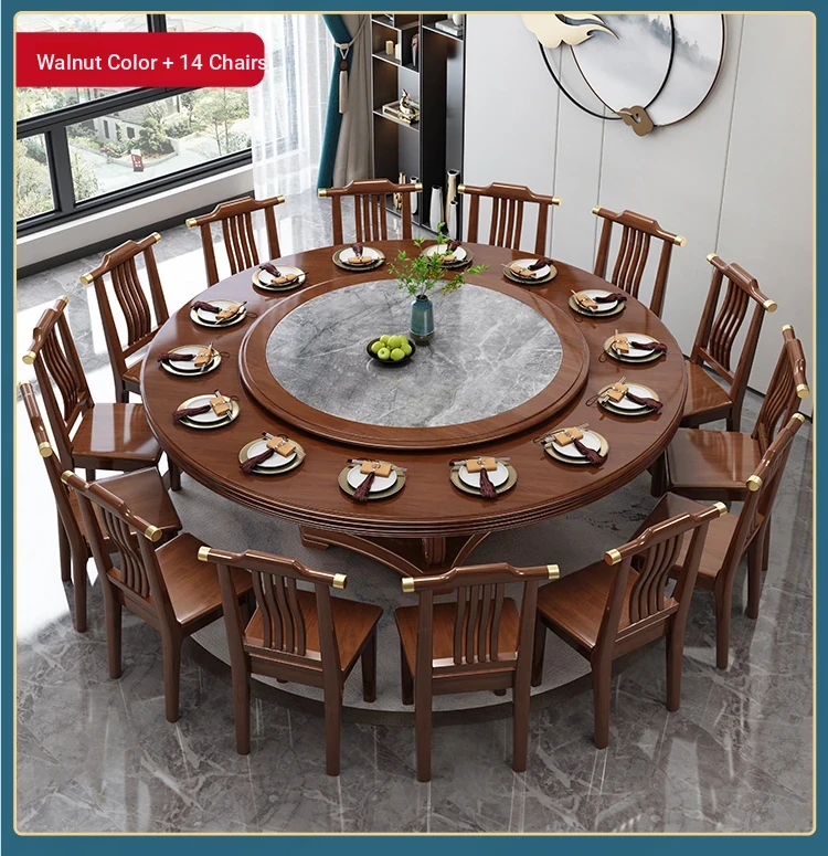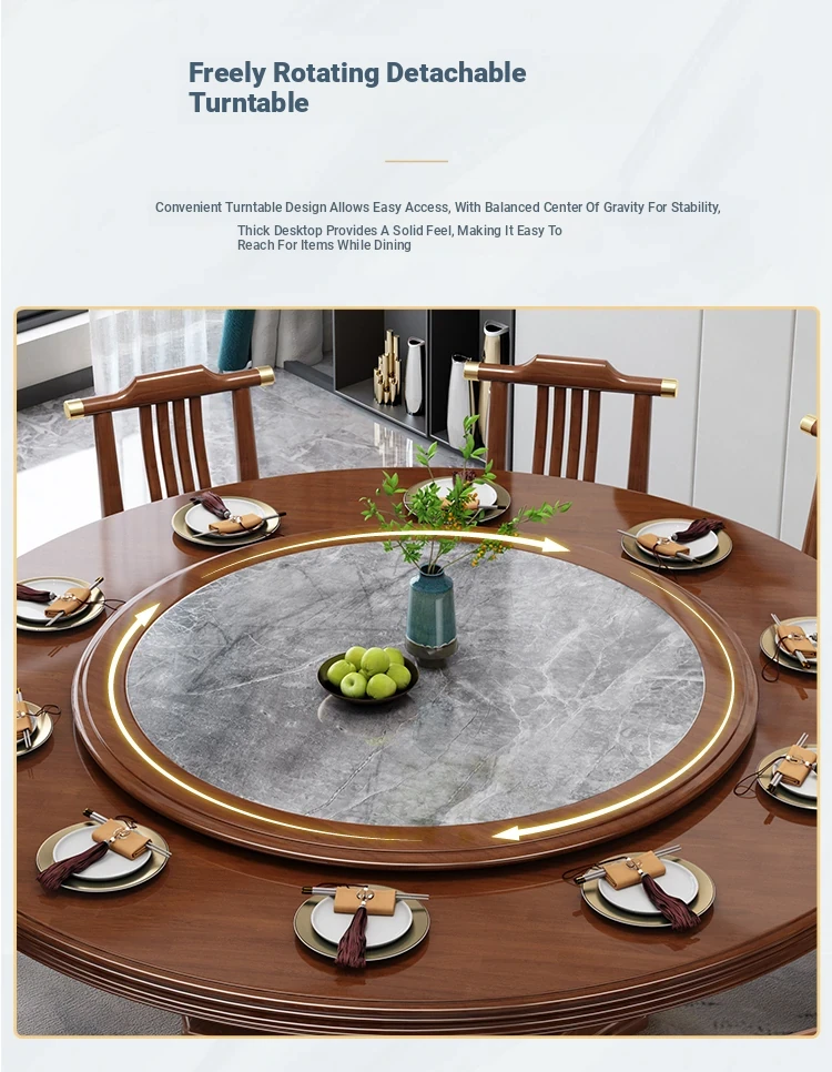 New Chinese Style Solid Wood Dining Table with Rotating Tray - Spacious 2M Round Table for 10 People, Perfect for Home and Hotel Dining Experience