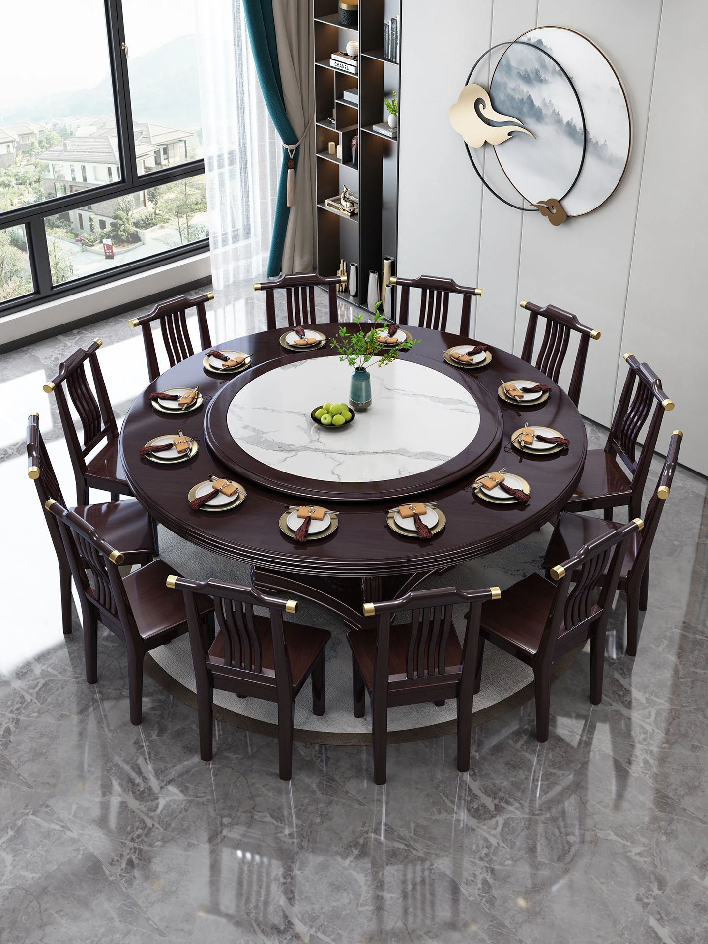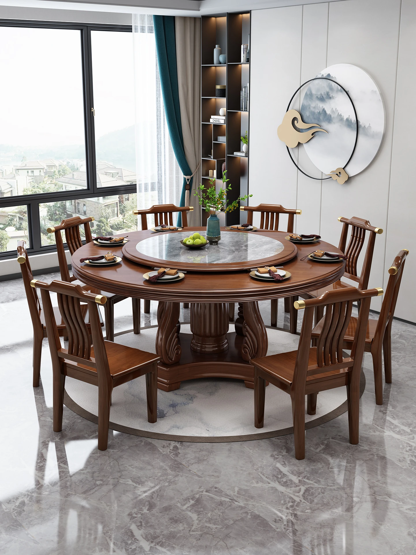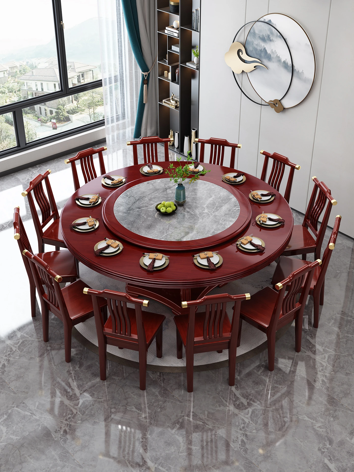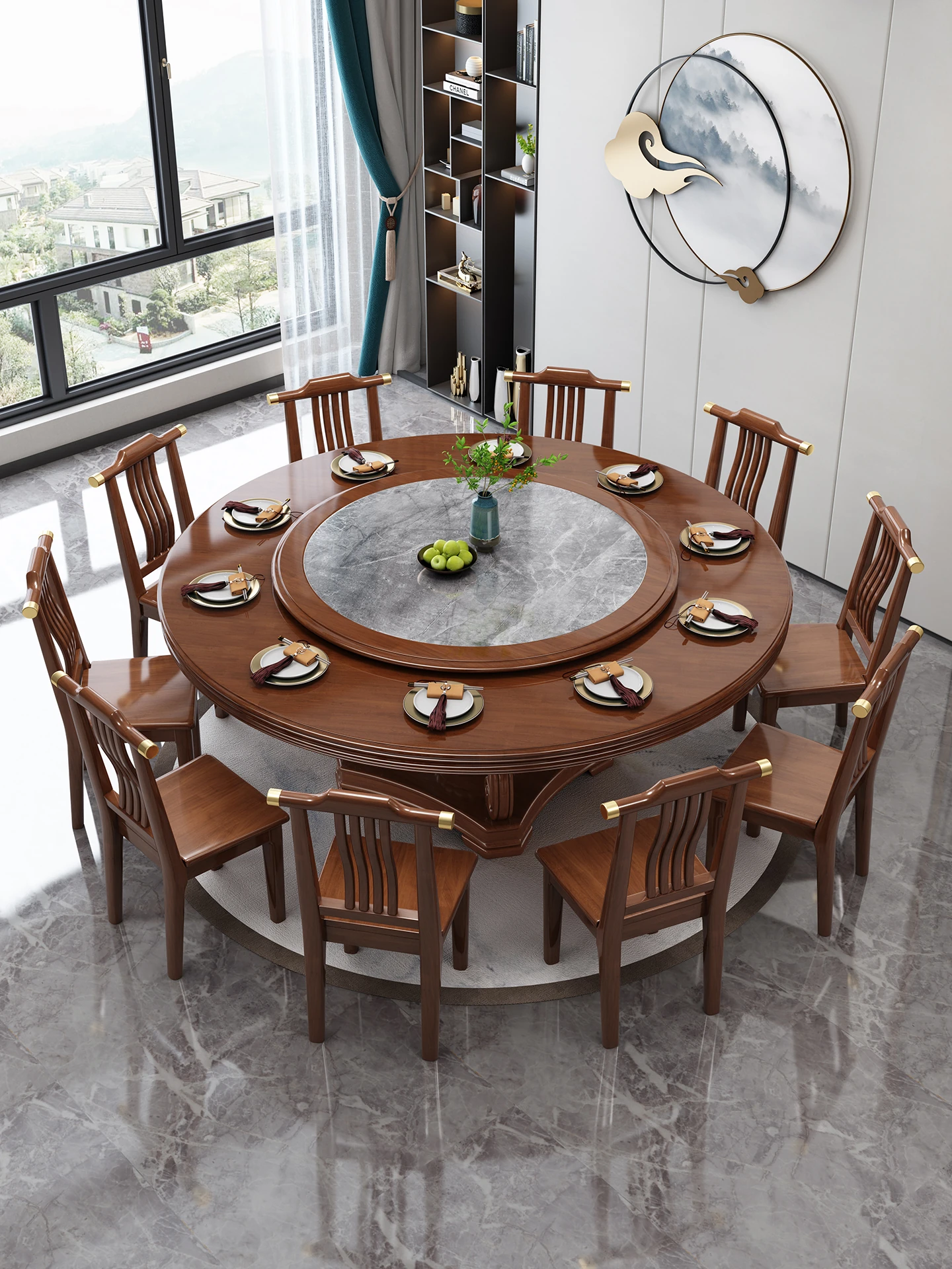 New Chinese Style Solid Wood Dining Table with Rotating Tray - Spacious 2M Round Table for 10 People, Perfect for Home and Hotel Dining Experience
