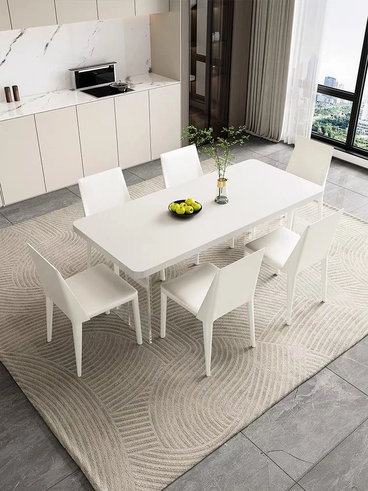 Minimalist Acrylic Floating Rock Dining Table - Pure White Cream Style, Perfect for Small Spaces, Under-Mounted Design, Elegant Rectangular Shape for Home Use.