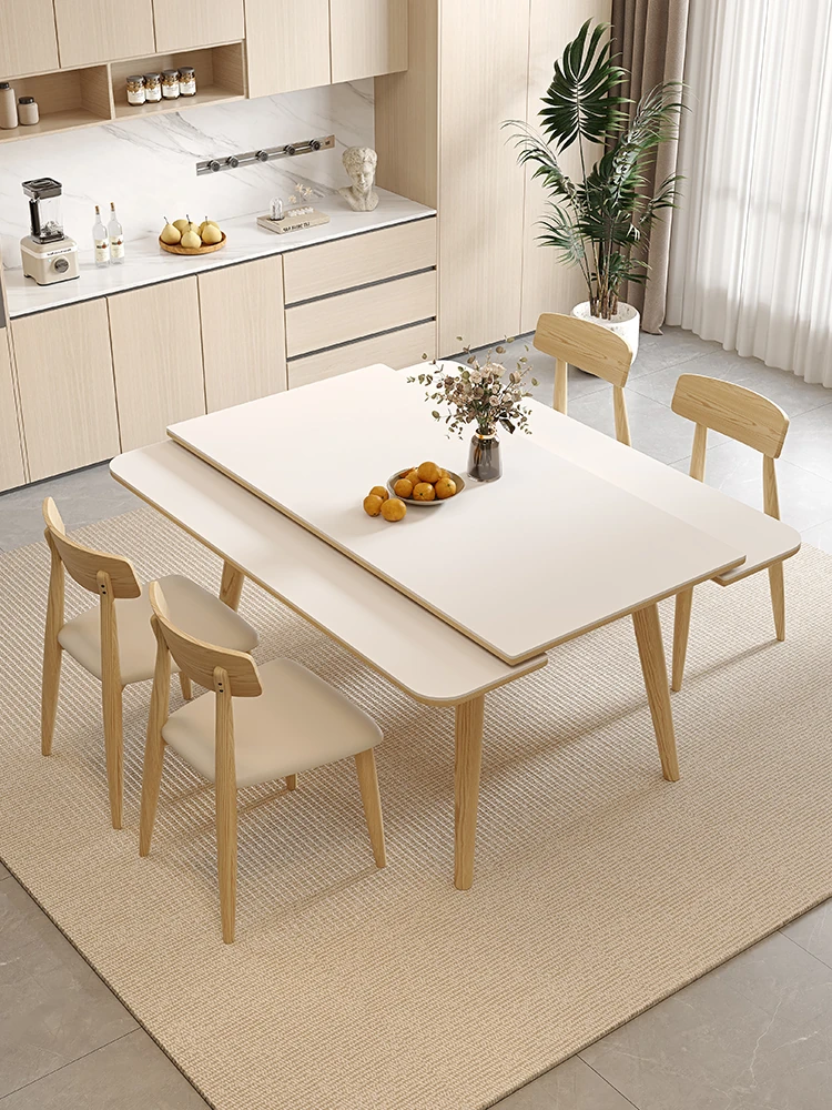 Creamy White Matte Rock Panel Dining Table - Modern Minimalist Rectangular Solid Wood Expandable & Foldable Table for Home Use