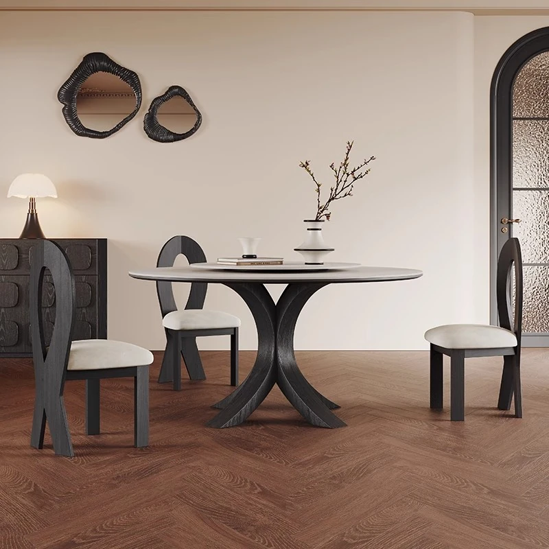 Nordic Vintage Round Solid Wood Dining Table with Rock Plate - 2025 New Retro French Style with Lazy Susan for Cozy Family Gatherings