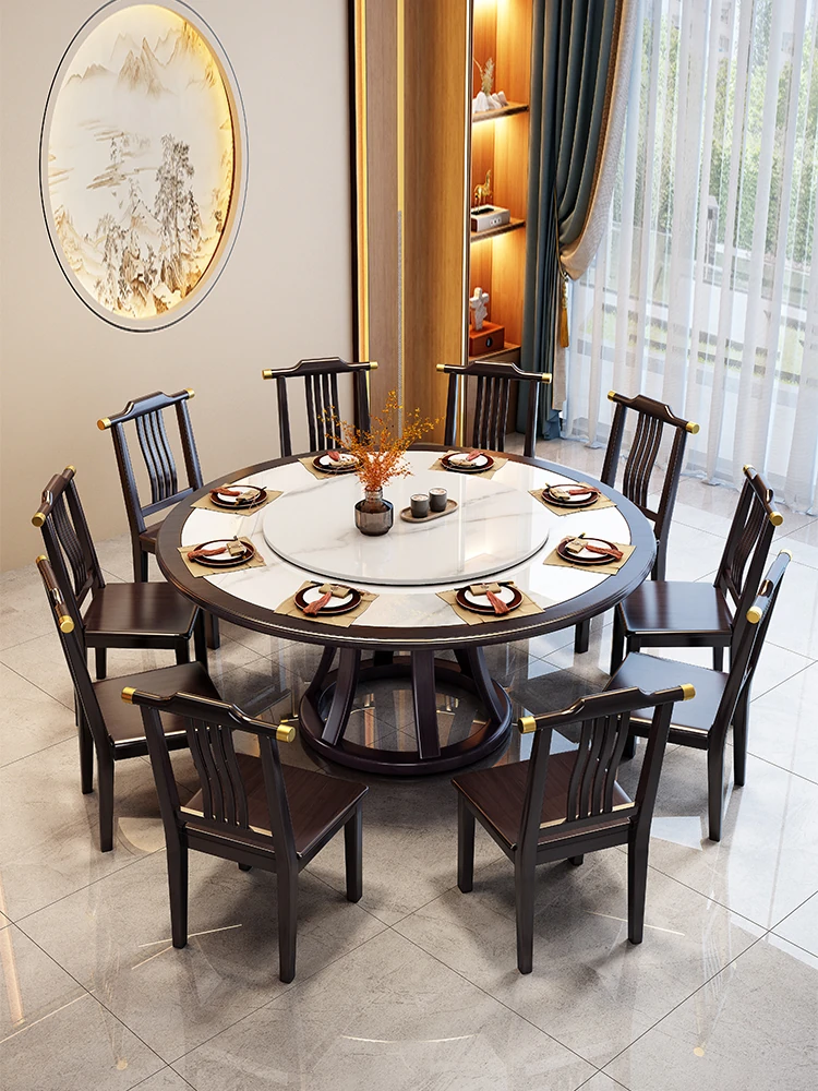 Solid Wood Dining Table and Chair Set with Rotating Tray - Modern Chinese Style Large Round Table for Home Use, Ideal for Restaurants, Featuring Induction Stove and Hot Pot Function