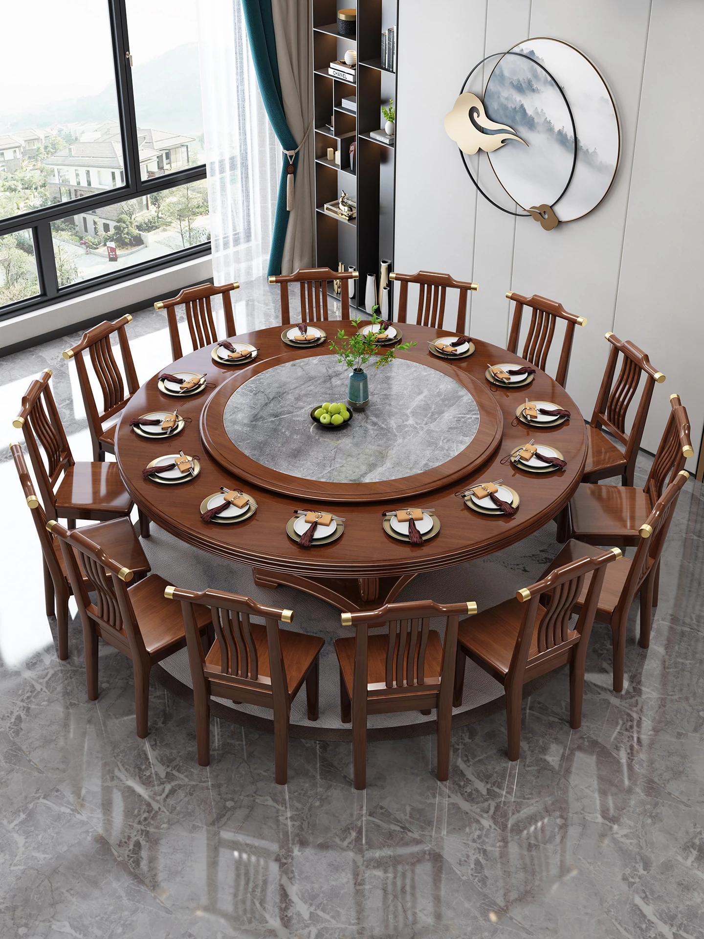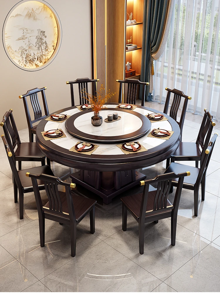 Elegant New Chinese Style 1.8m Round Dining Table with Rotating Tray – Solid Wood and Marble Design for 10 People, Perfect for Family Gatherings and Special Occasions