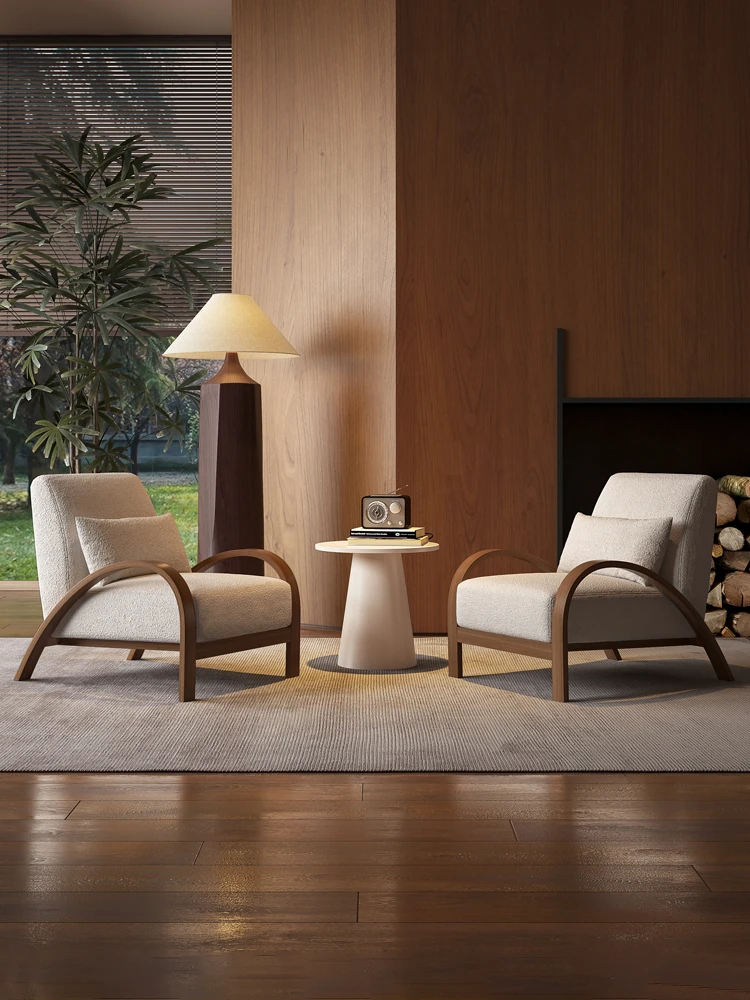 French Vintage Wabi-Sabi Solid Wood Leisure Chair - Creamy Lamb Fleece Designer Armchair for Cozy Homestays - Perfect for Relaxation and Style
