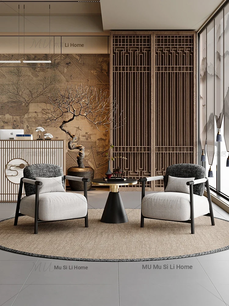 Modern Chinese Style Single Leisure Sofa Chair - Designer Tea Room Reception Set, Includes One Table and Two Chairs for Relaxation and Conversations