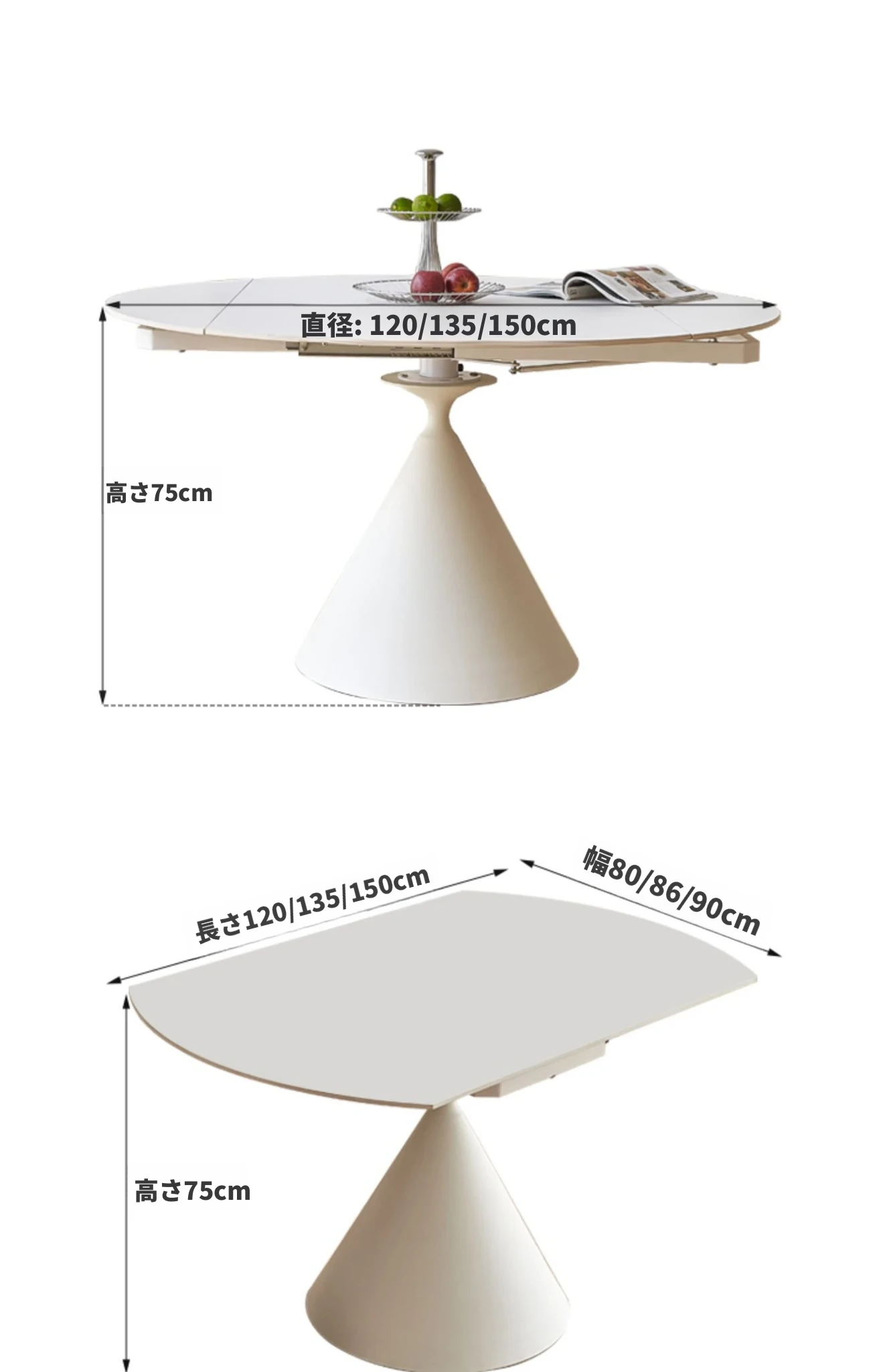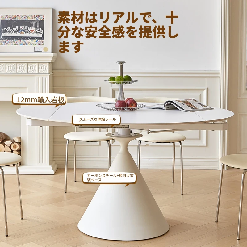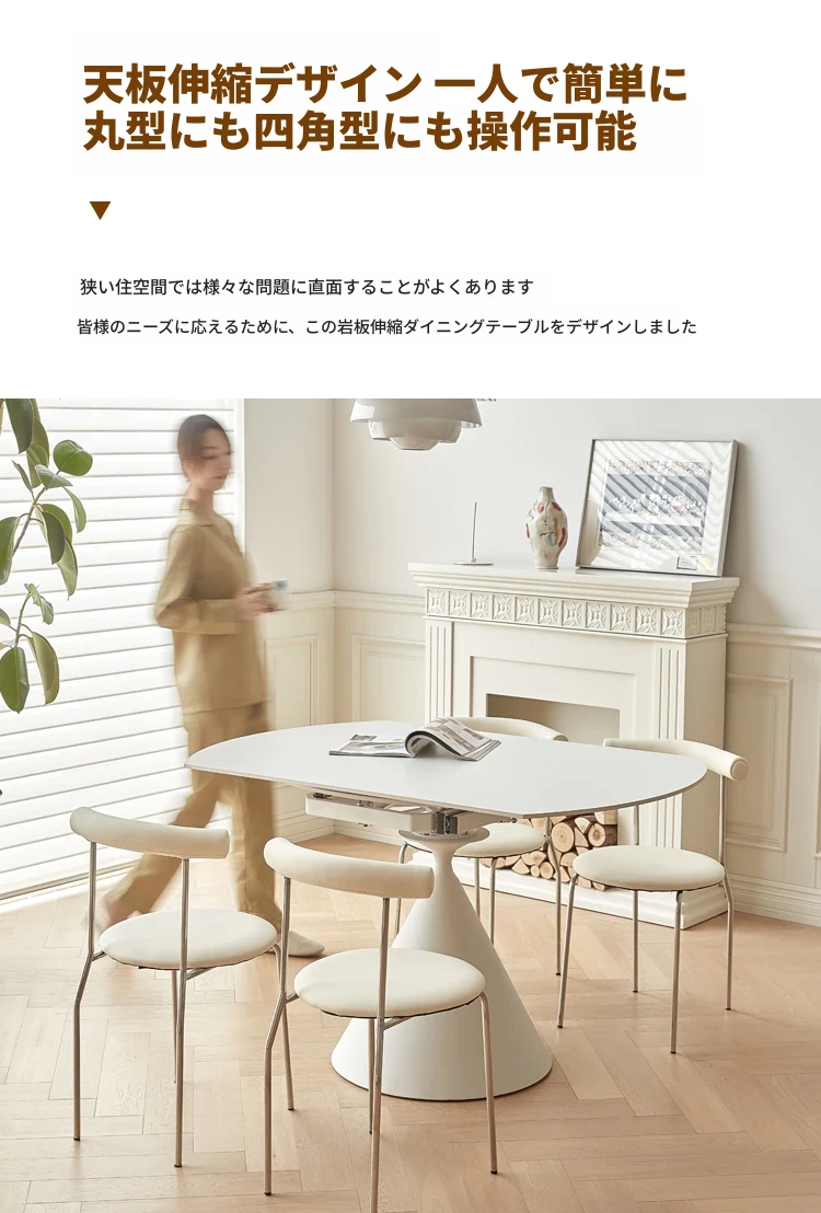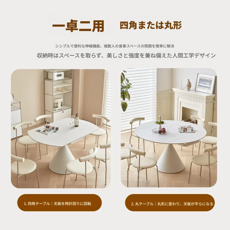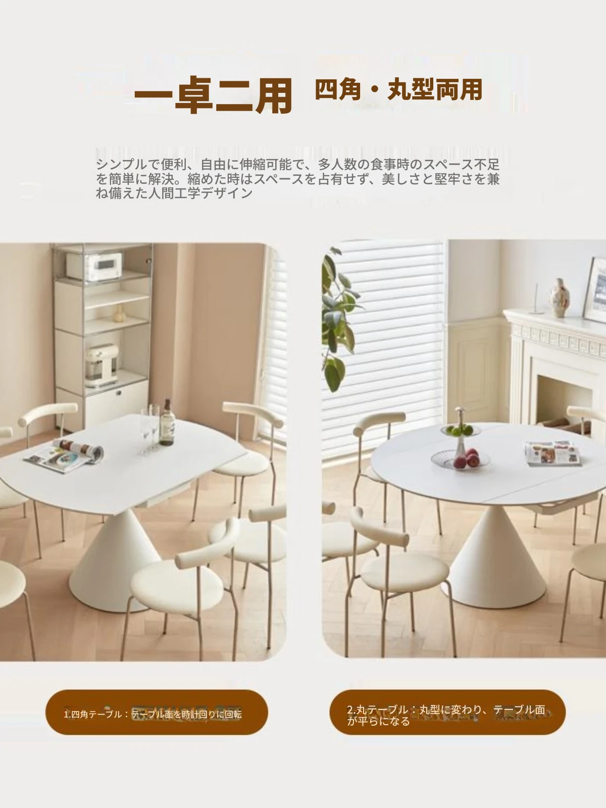 クリーミーなホワイトの岩板ダイニングテーブル&チェアセット、回転式&伸縮可能!小さなスペースにもぴったりの折りたたみ式、四角と丸の両方で使える便利なデザイン。家庭用に最適!