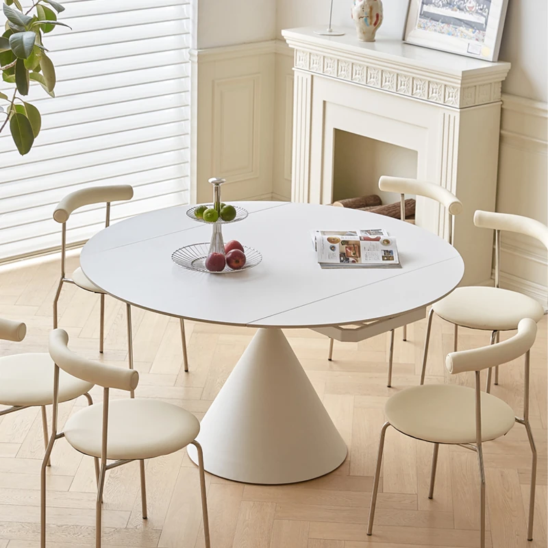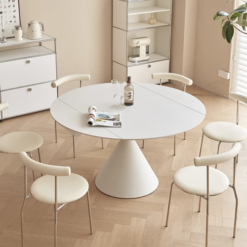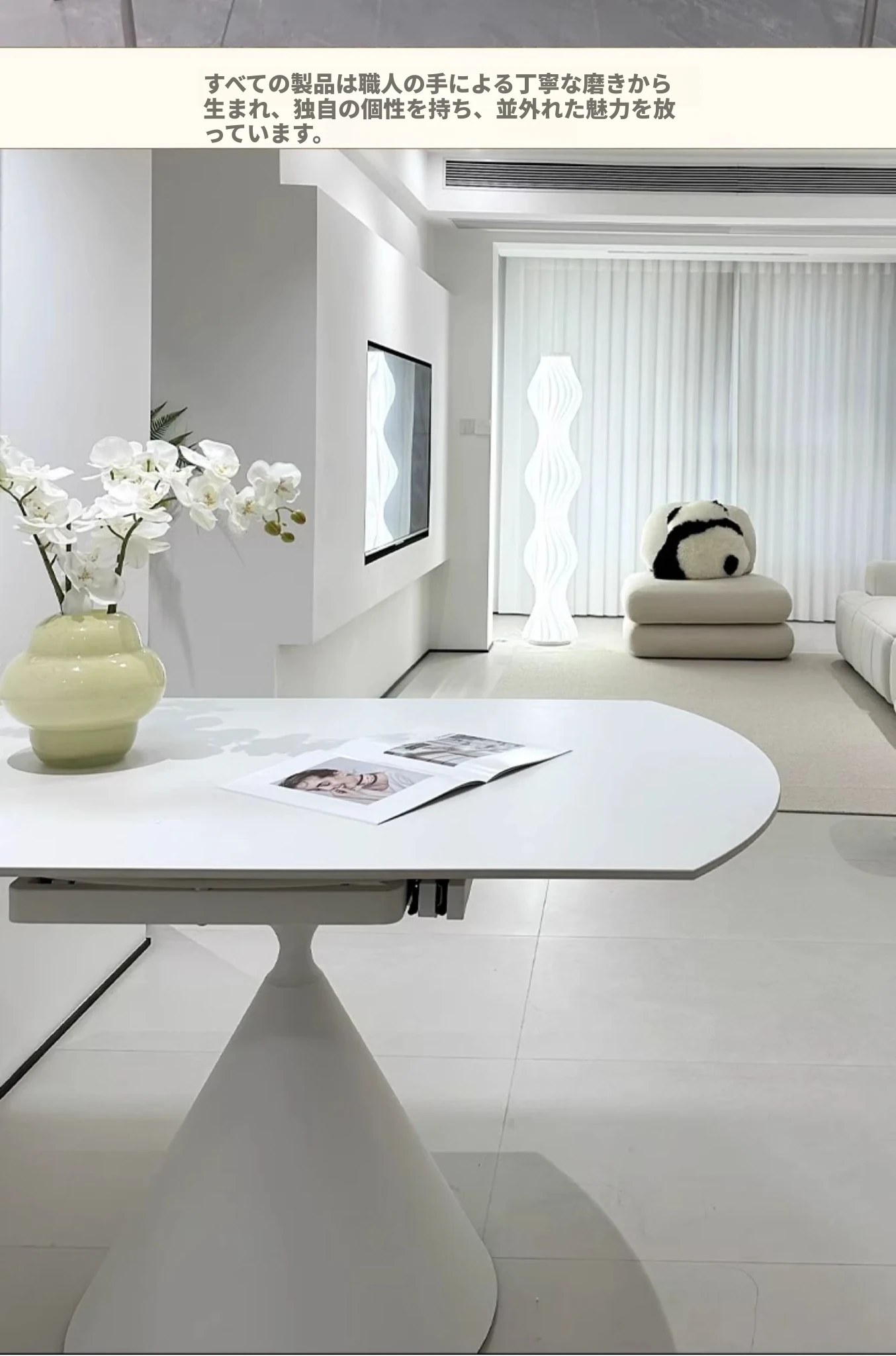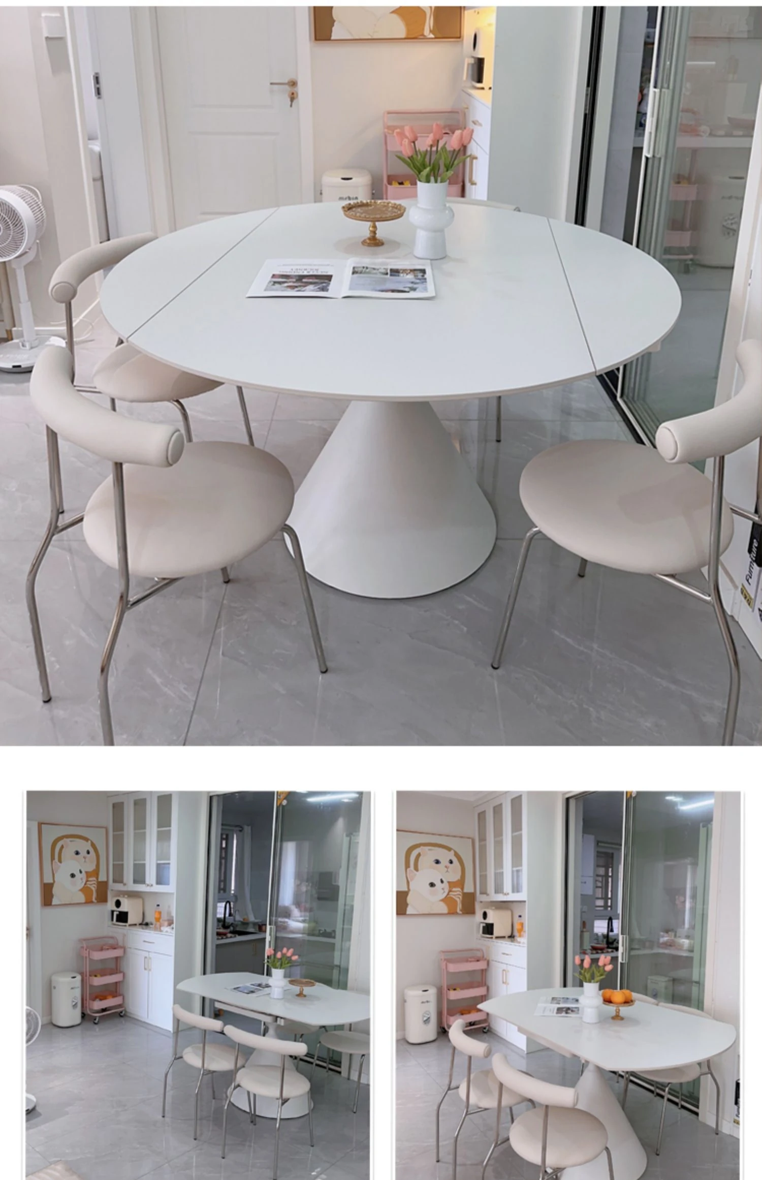 クリーミーなホワイトの岩板ダイニングテーブル&チェアセット、回転式&伸縮可能!小さなスペースにもぴったりの折りたたみ式、四角と丸の両方で使える便利なデザイン。家庭用に最適!