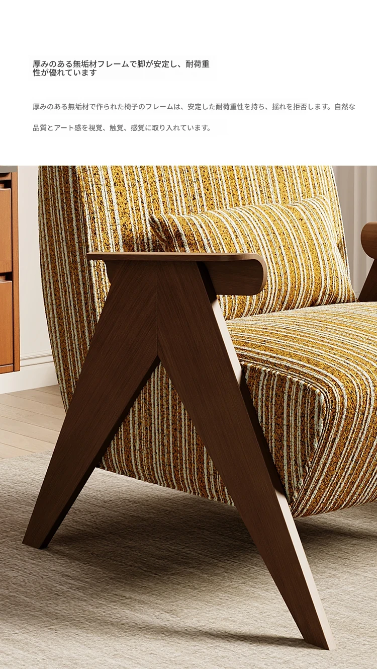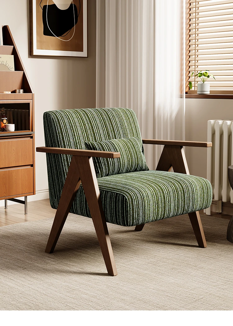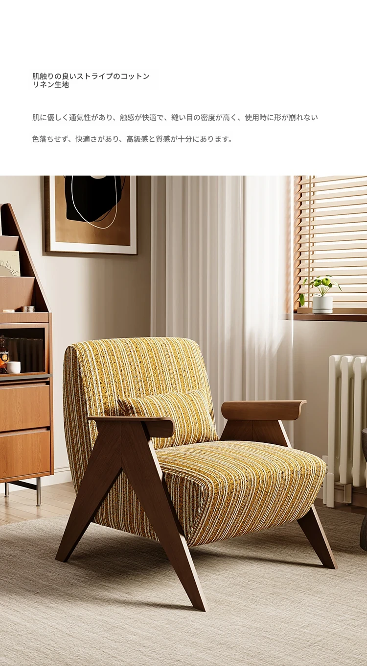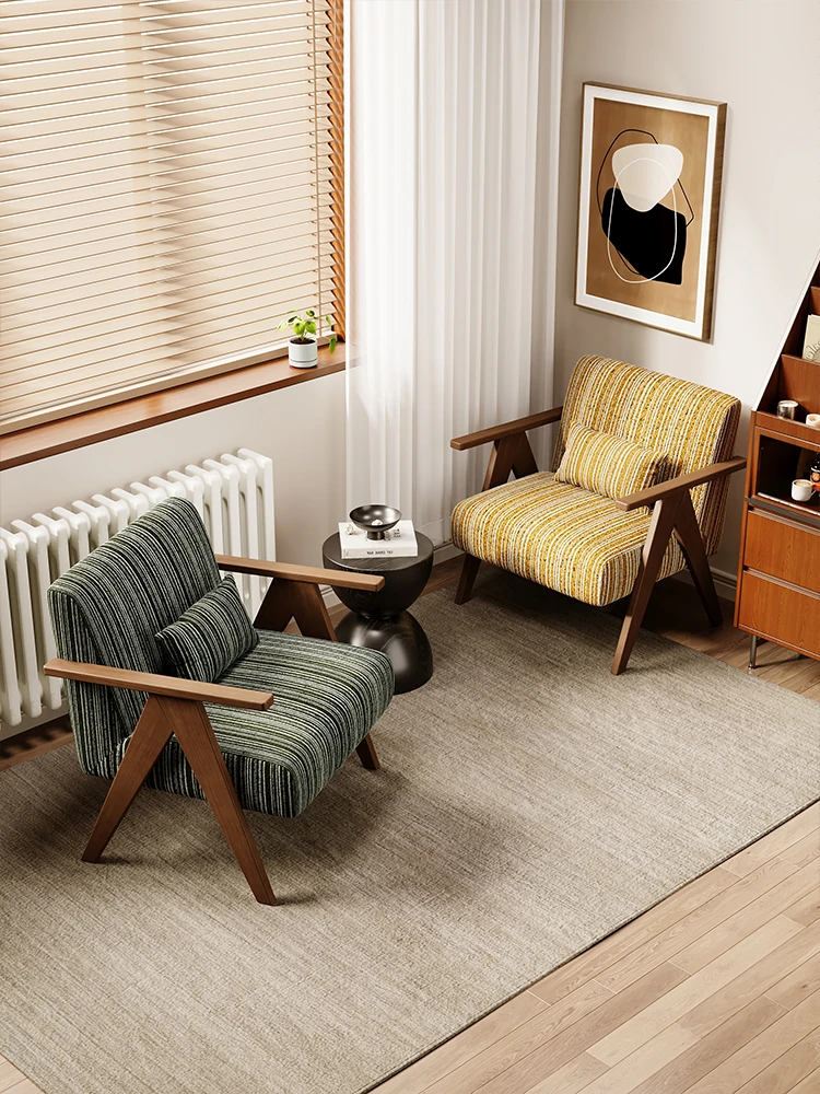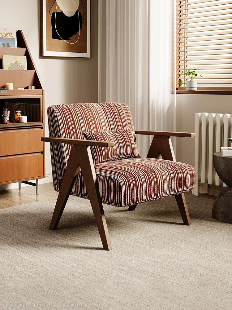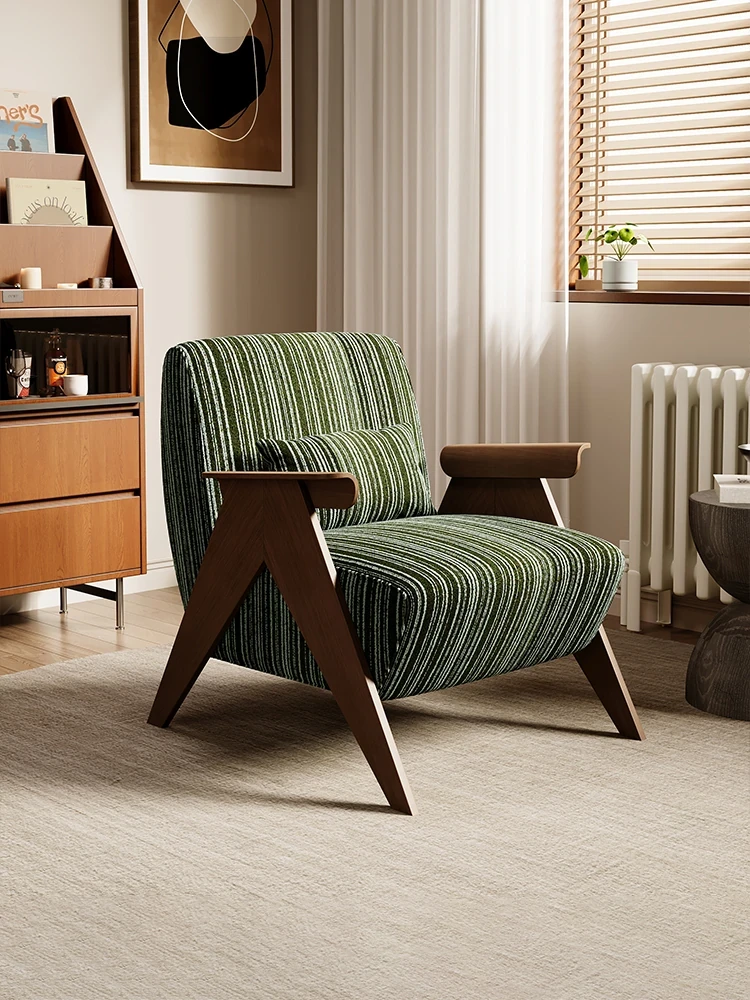 デザイナーの一人用ソファチェア - アメリカンヴィンテージスタイルのレトロなデザインで、リビングルーム、バルコニー、寝室に最適!リラックスできる空間を演出する、実木製のオシャレなリゾート宿泊施設にもぴったりなアイテムです。