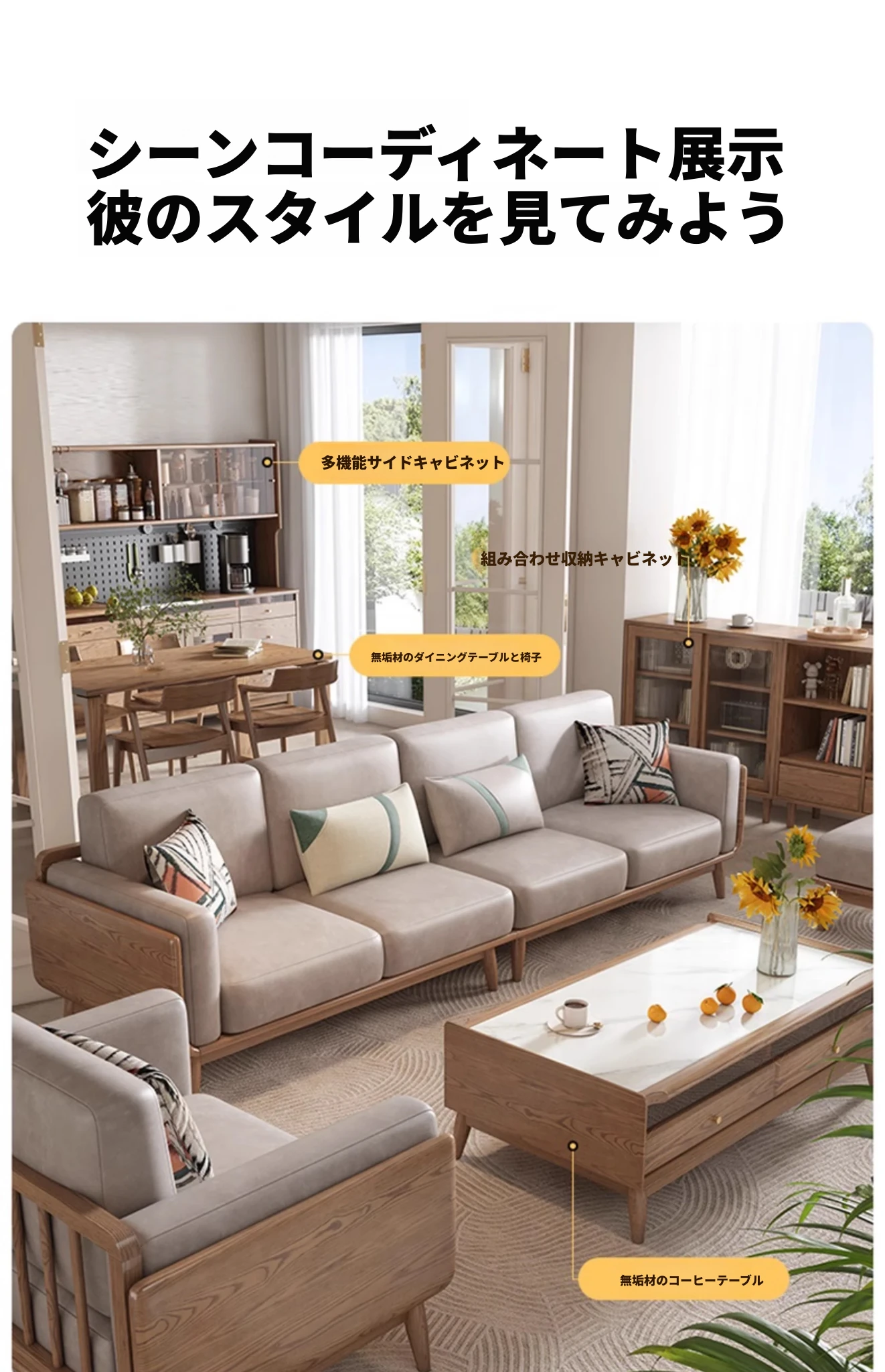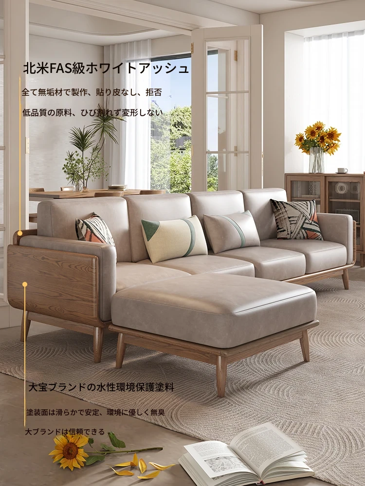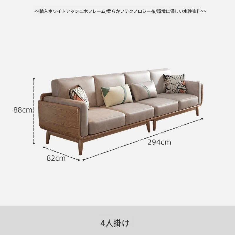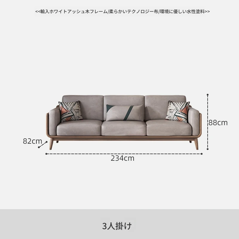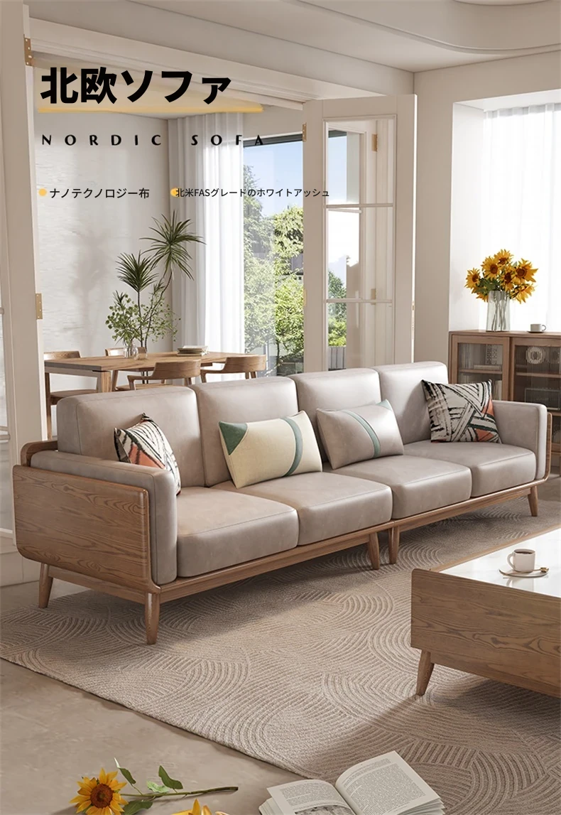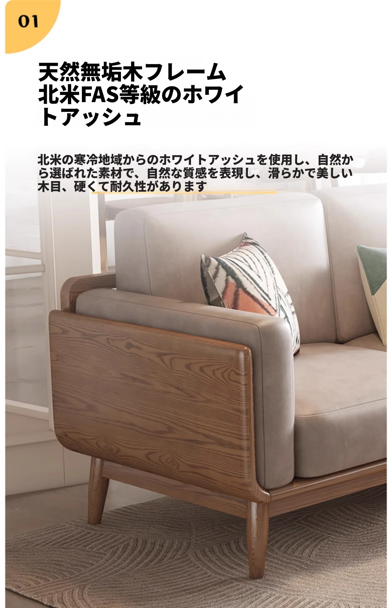 北欧風シンプル全木製ソファセット - 小型リビングに最適なホワイトアッシュ材の3人掛けソファで、自然の温もりを感じる快適な空間を演出します!