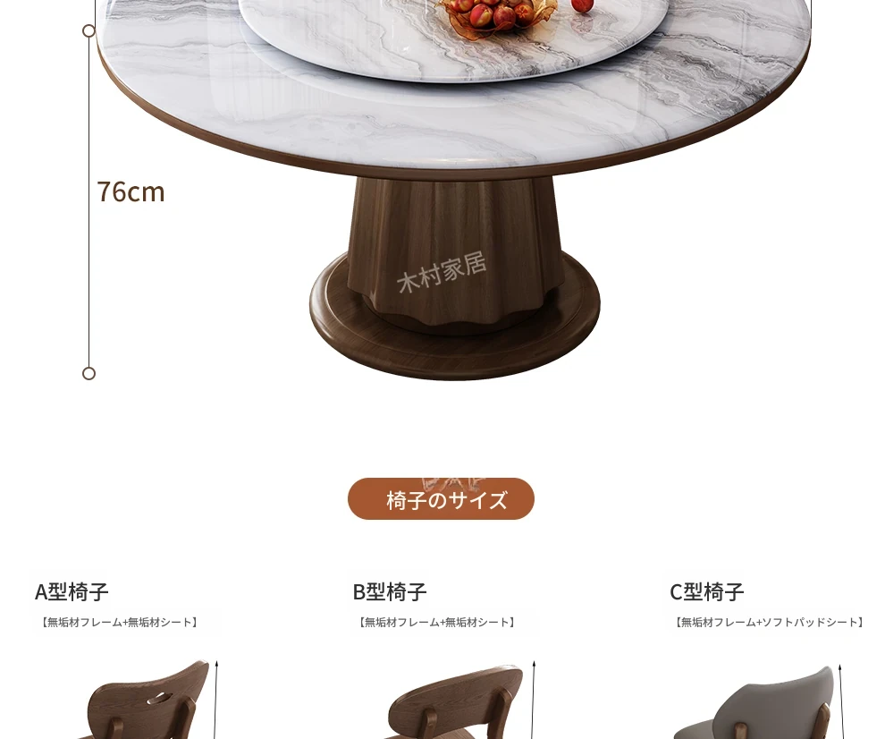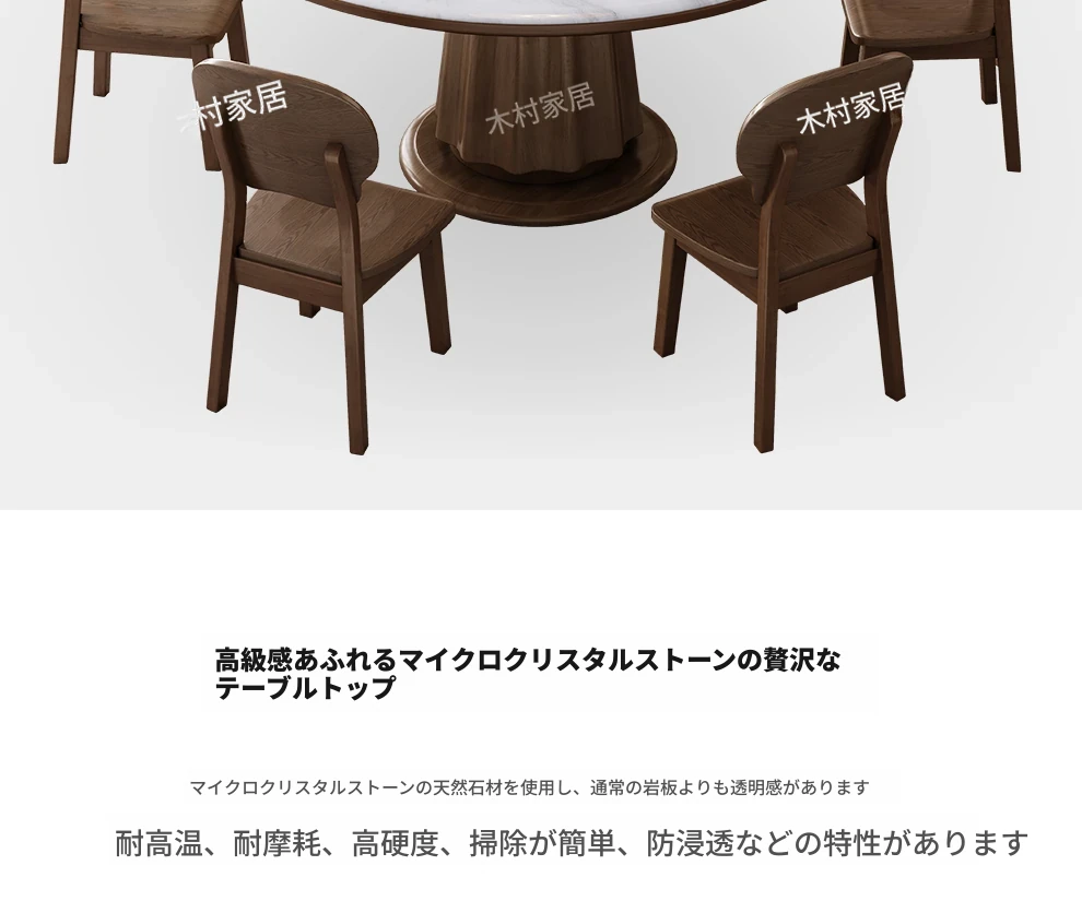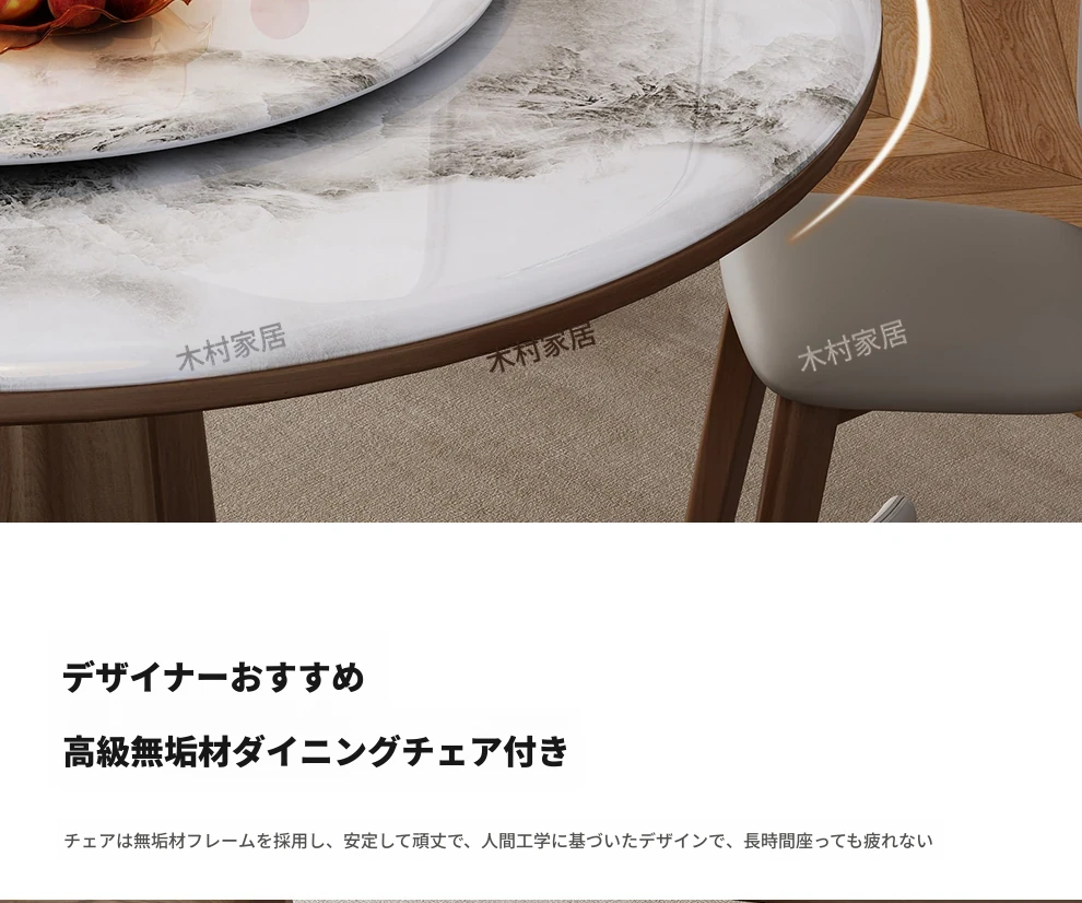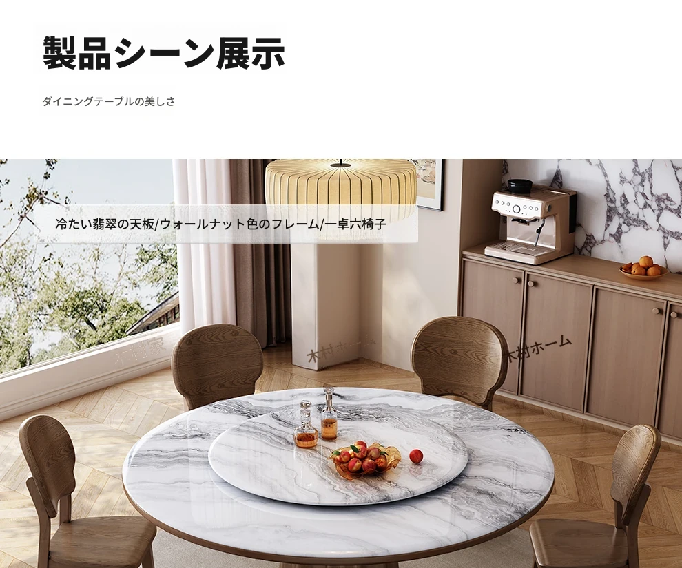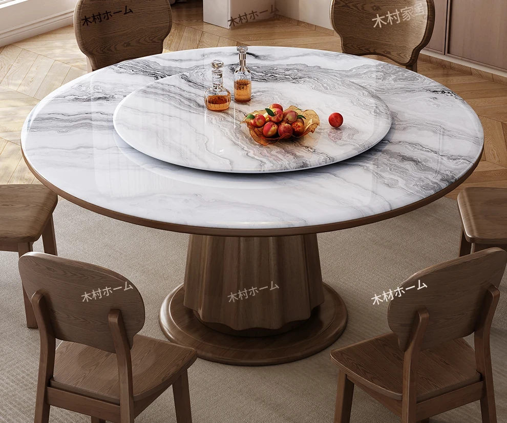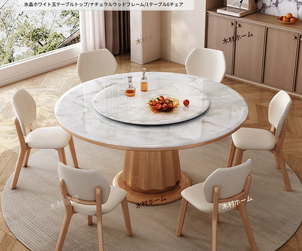 高級感あふれる無垢材と大理石のダイニングテーブル&チェアセット|回転式プレート付きのラウンドテーブルで、贅沢な食事体験を自宅で!優雅なリビングにぴったりのアイテム。