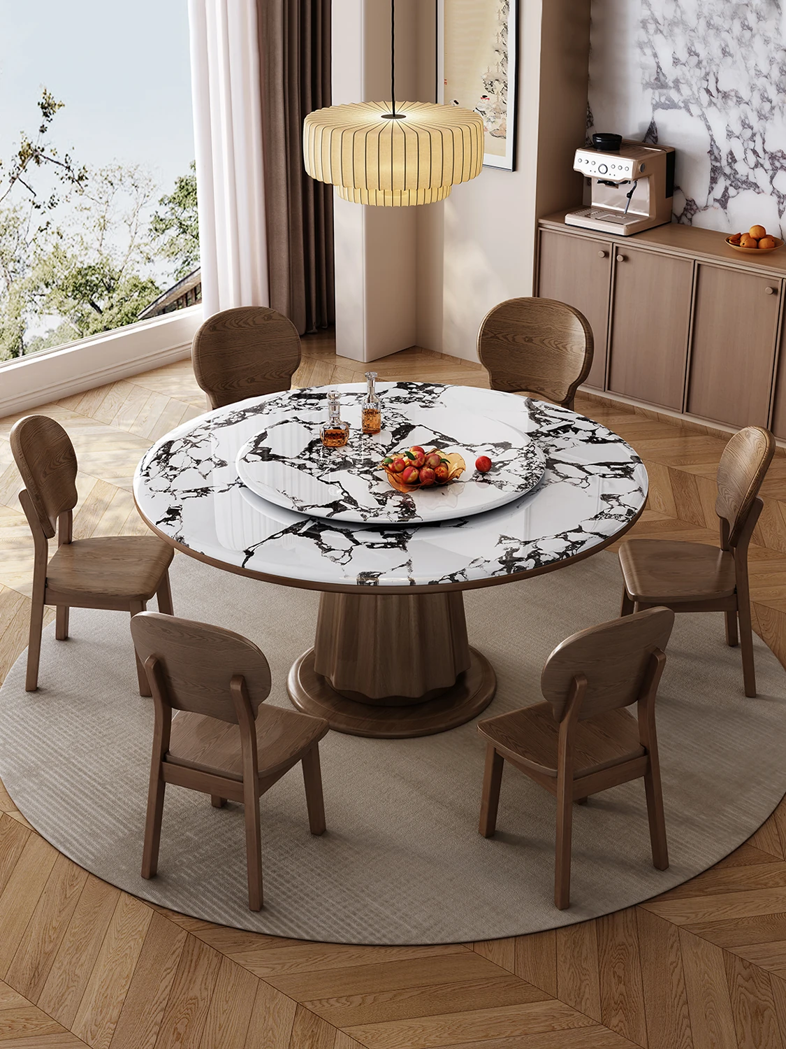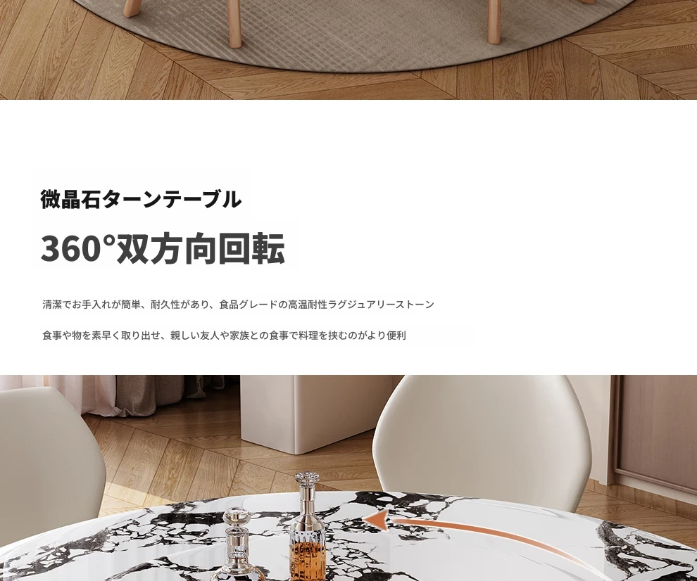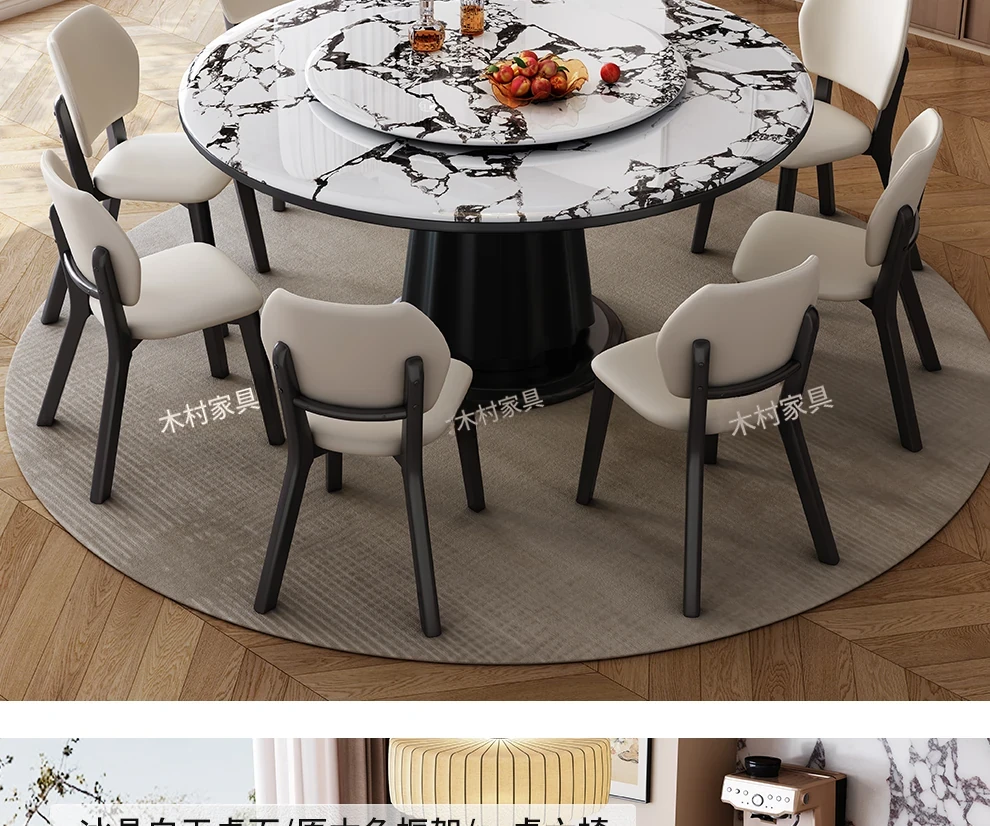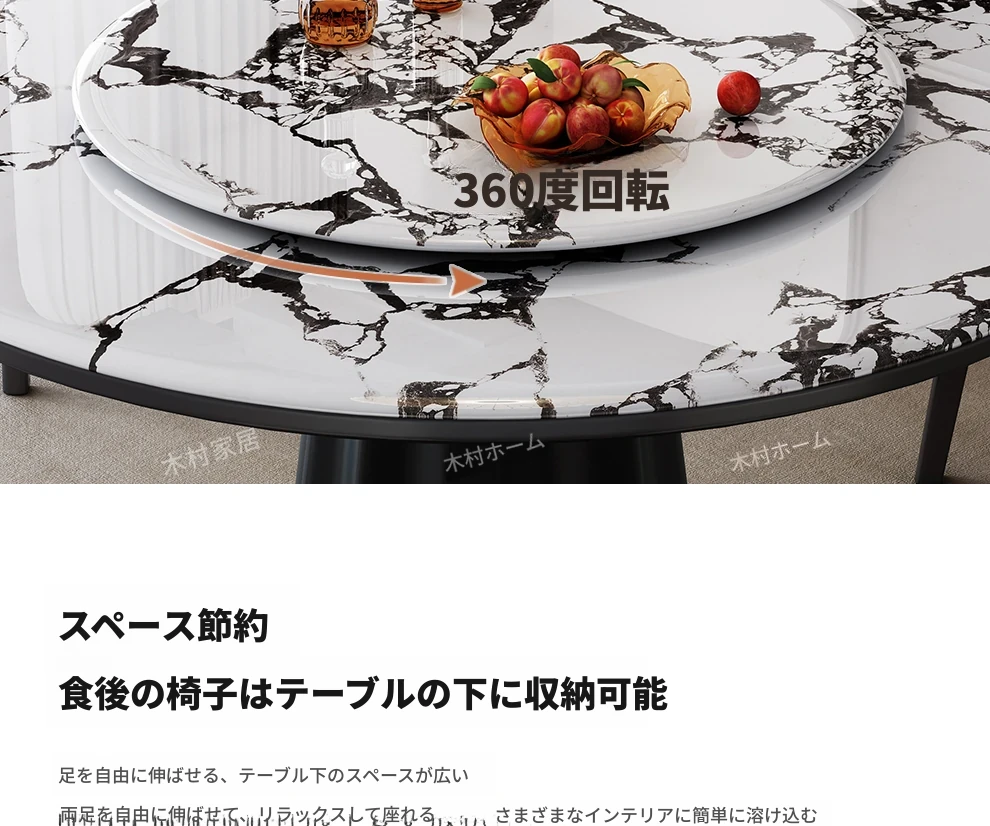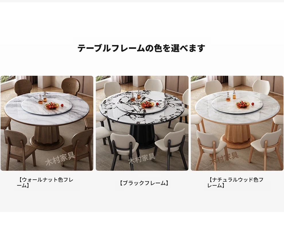 高級感あふれる無垢材と大理石のダイニングテーブル&チェアセット|回転式プレート付きのラウンドテーブルで、贅沢な食事体験を自宅で!優雅なリビングにぴったりのアイテム。