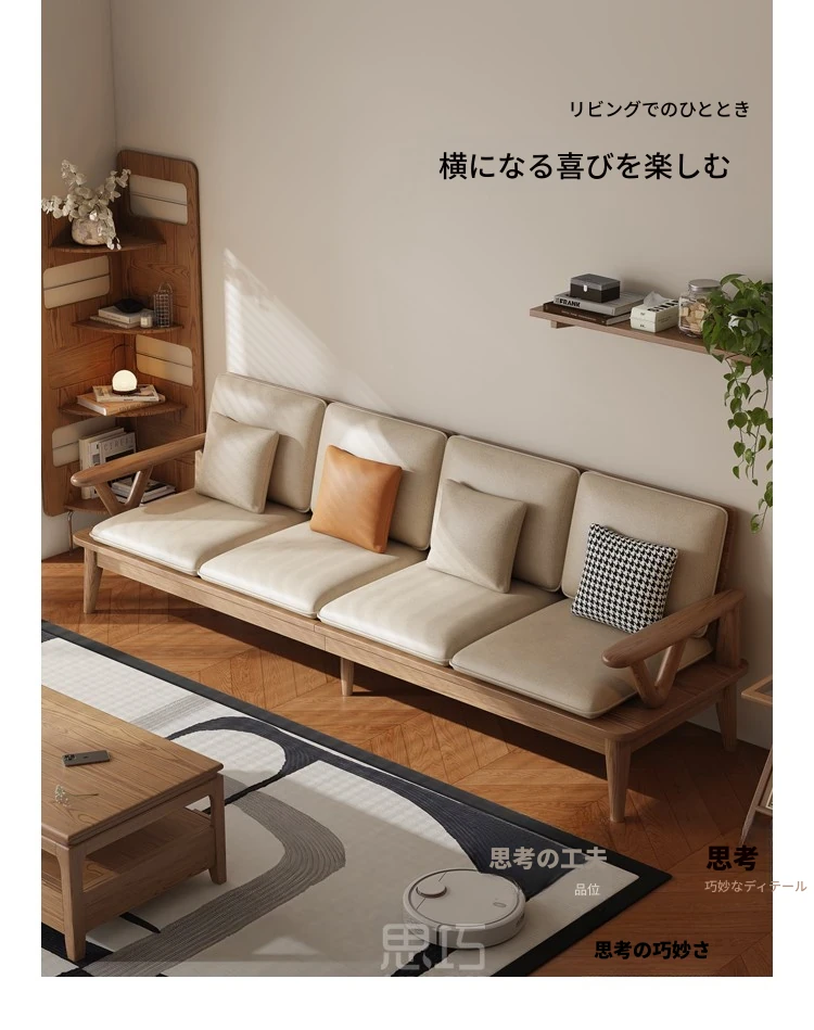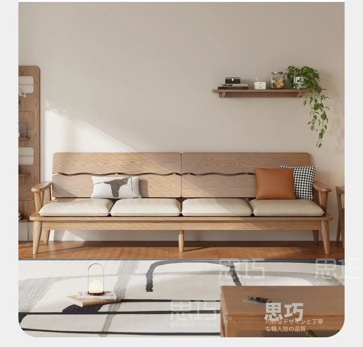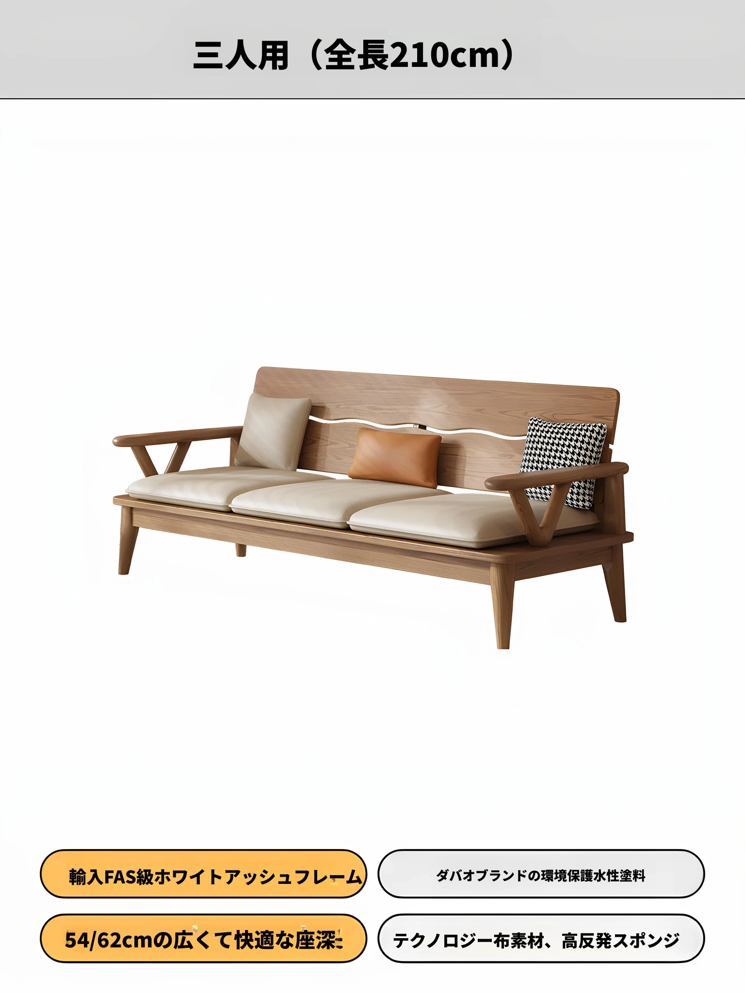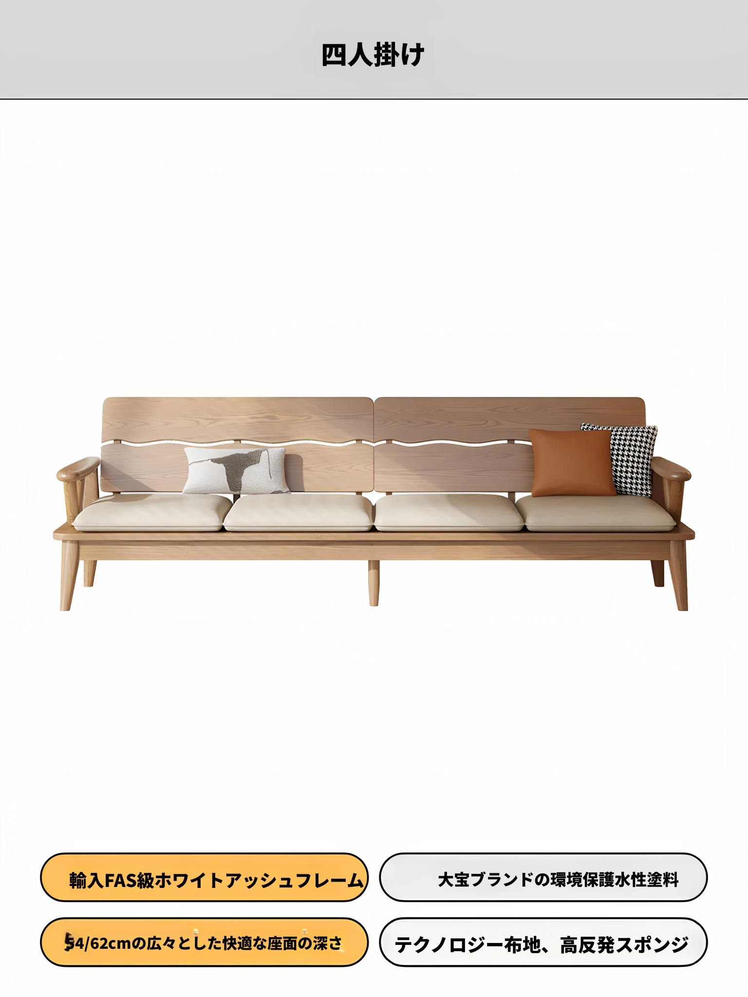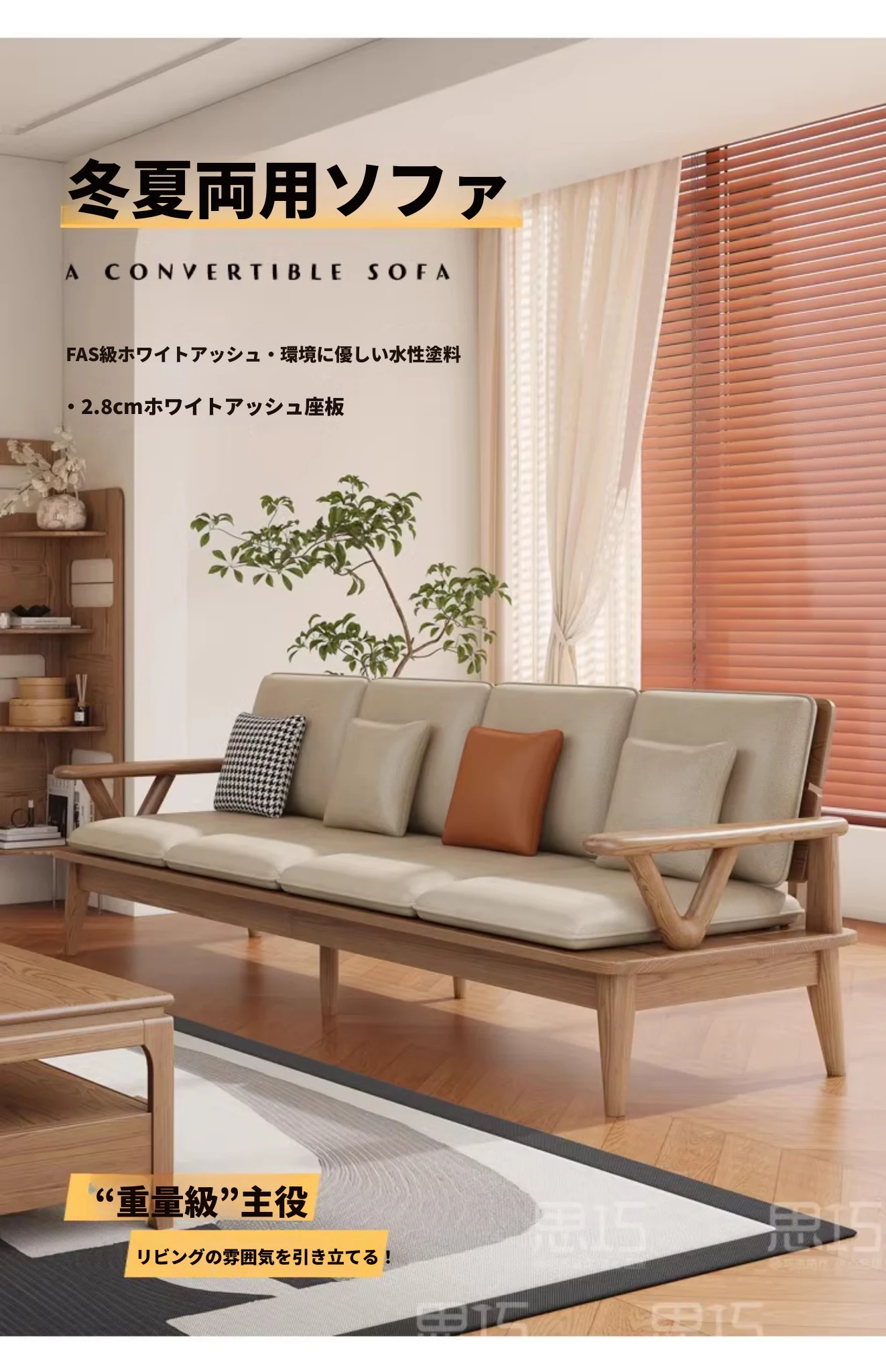 シンプルでモダンな無垢材ソファ - 新中式スタイルのリビングに最適!小型住宅向け、3人掛け・4人掛けのホワイトアッシュ無垢ソファ。洗練されたデザインで、居心地の良い空間を演出します。