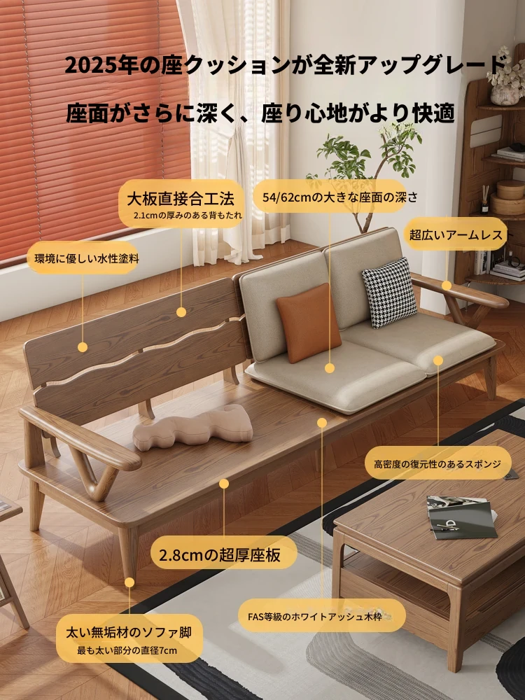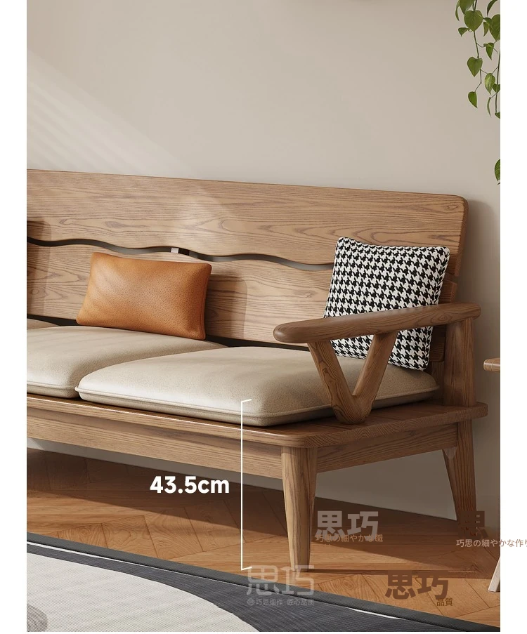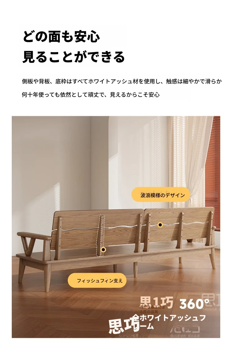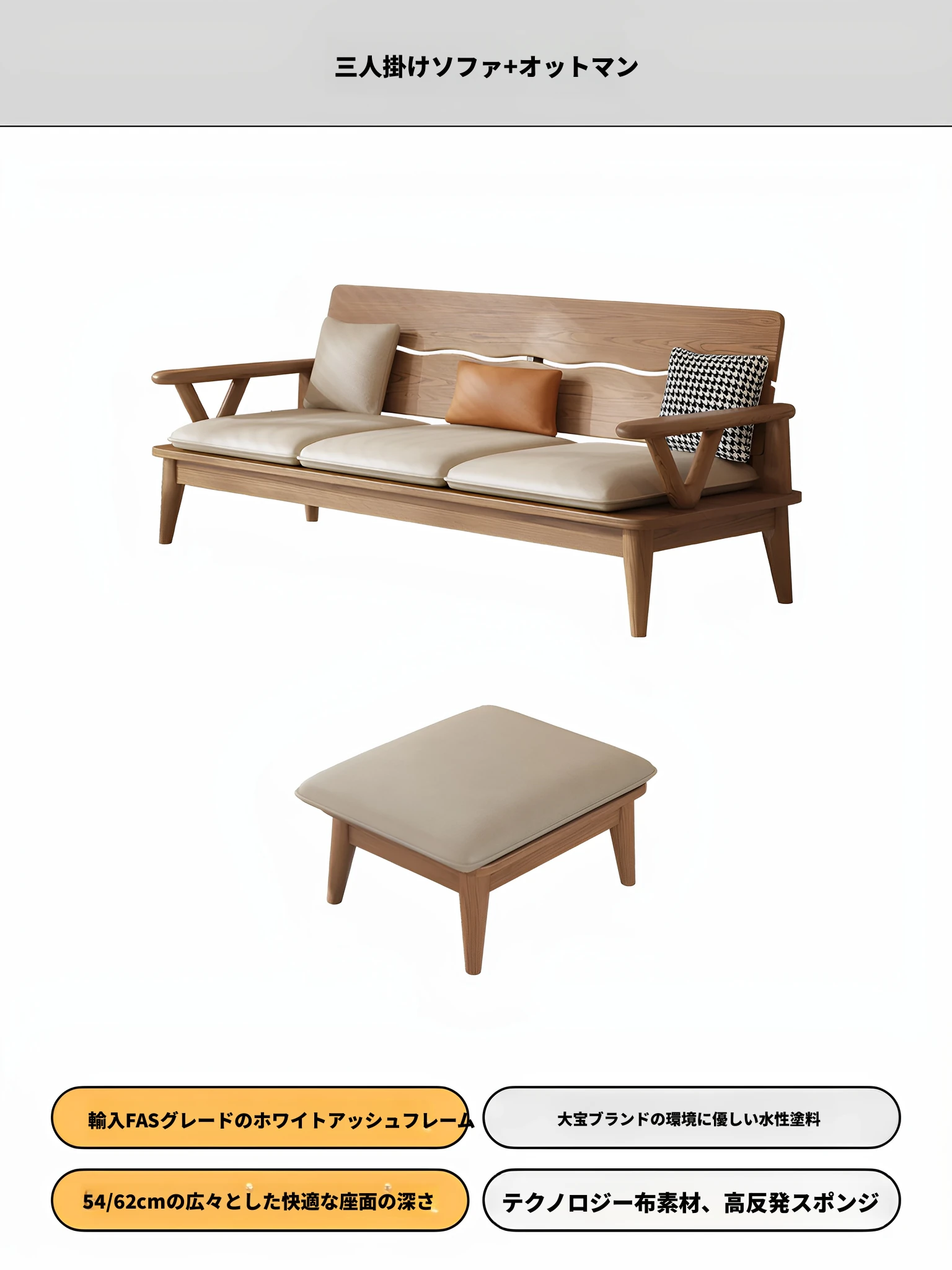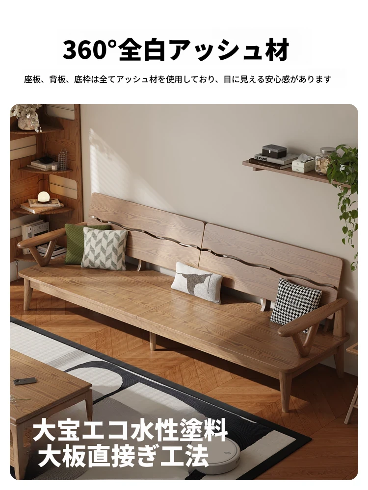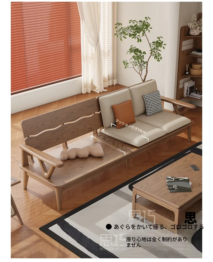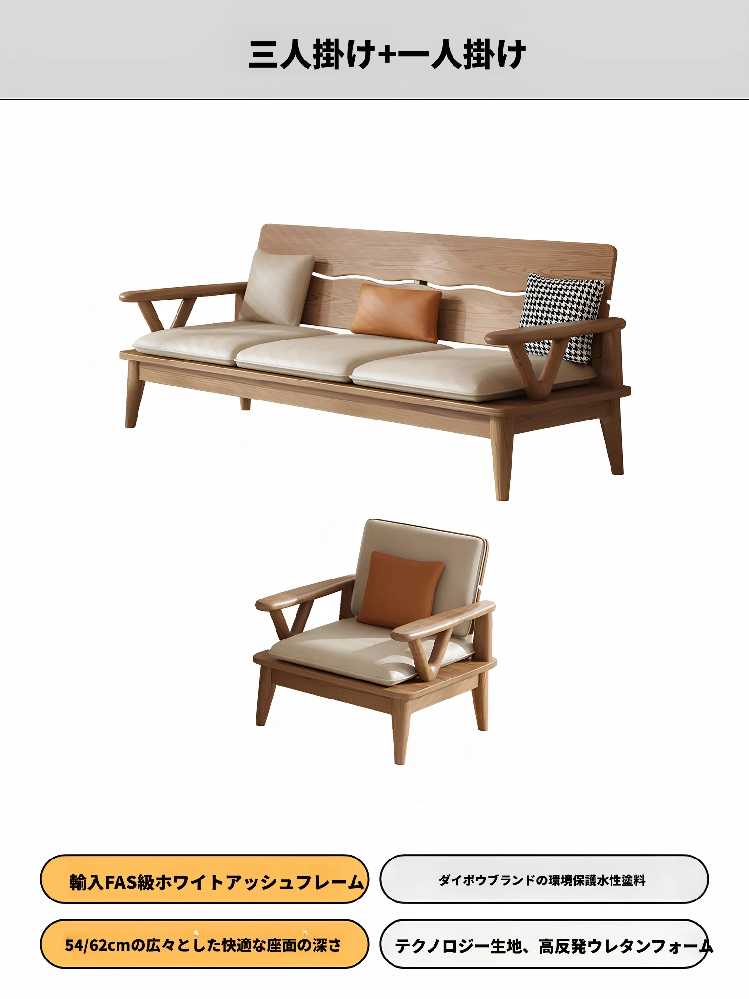 シンプルでモダンな無垢材ソファ - 新中式スタイルのリビングに最適!小型住宅向け、3人掛け・4人掛けのホワイトアッシュ無垢ソファ。洗練されたデザインで、居心地の良い空間を演出します。