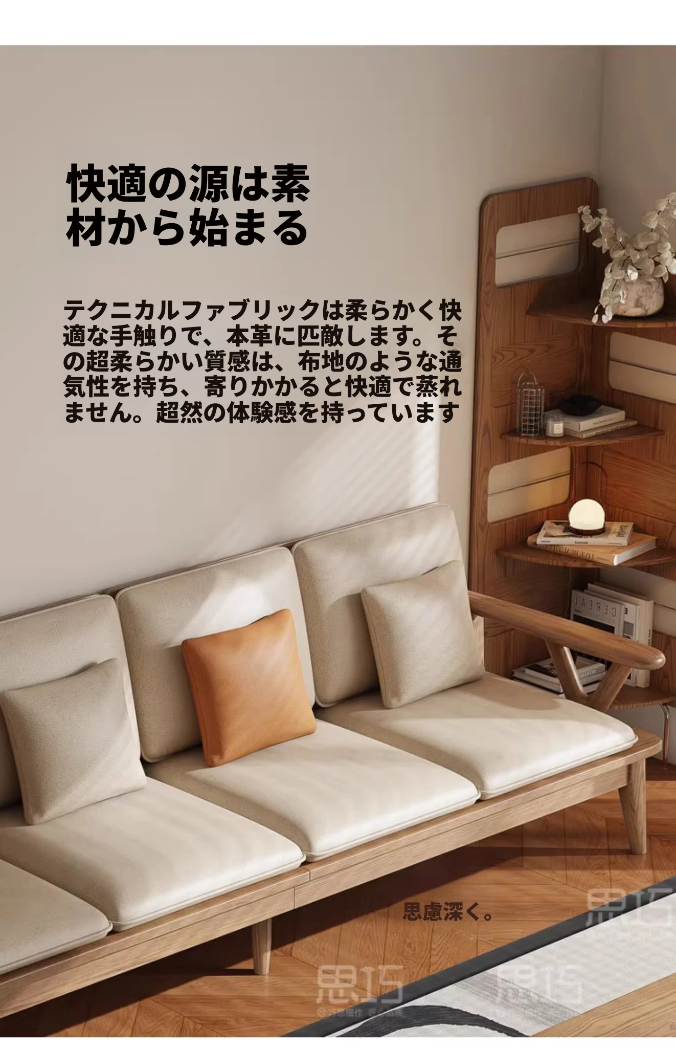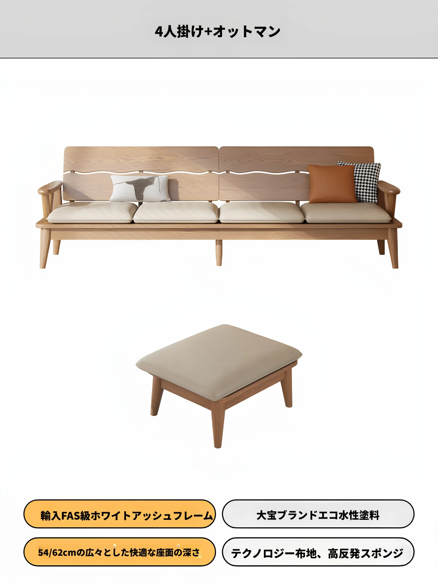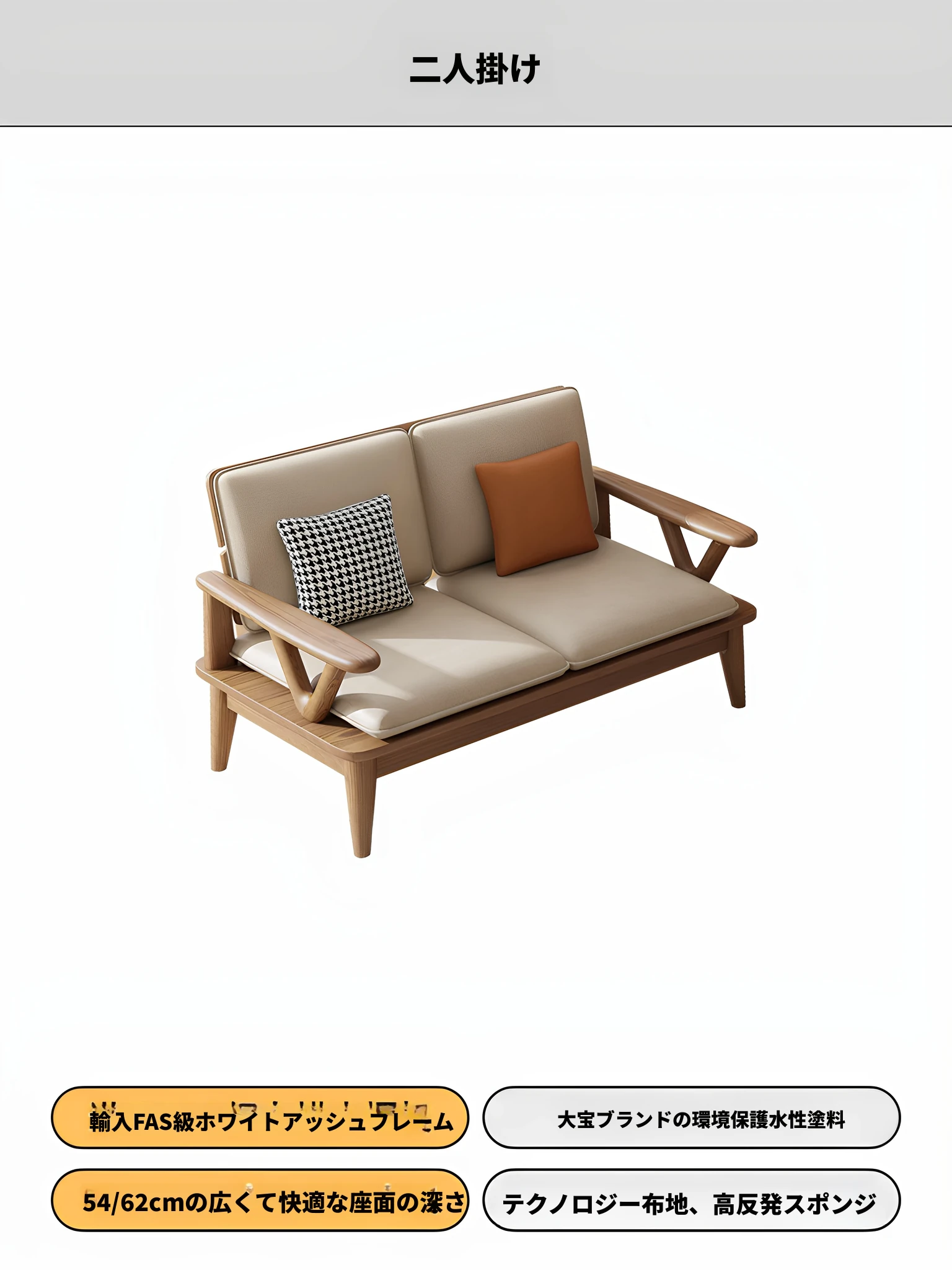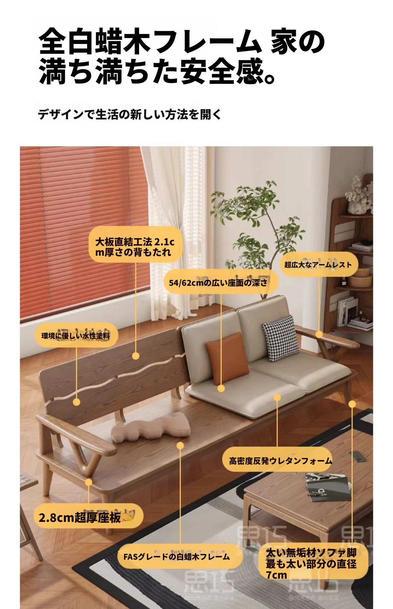 シンプルでモダンな無垢材ソファ - 新中式スタイルのリビングに最適!小型住宅向け、3人掛け・4人掛けのホワイトアッシュ無垢ソファ。洗練されたデザインで、居心地の良い空間を演出します。