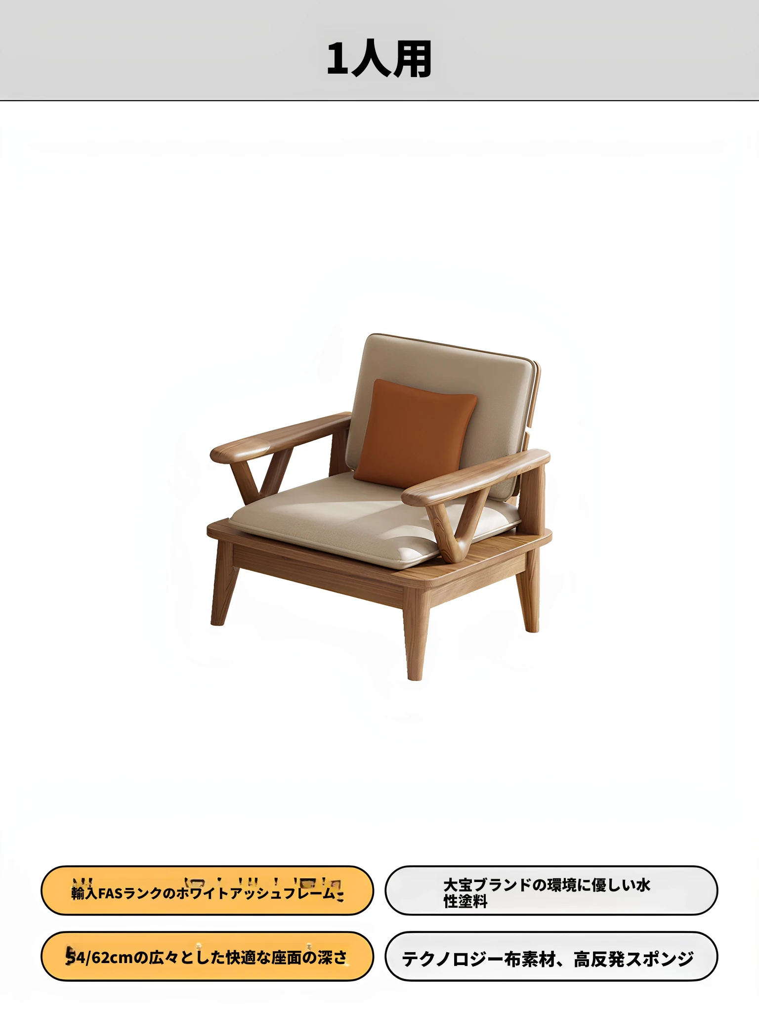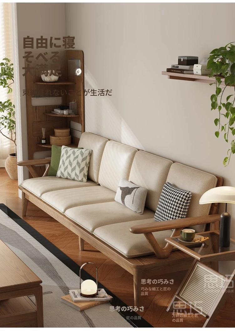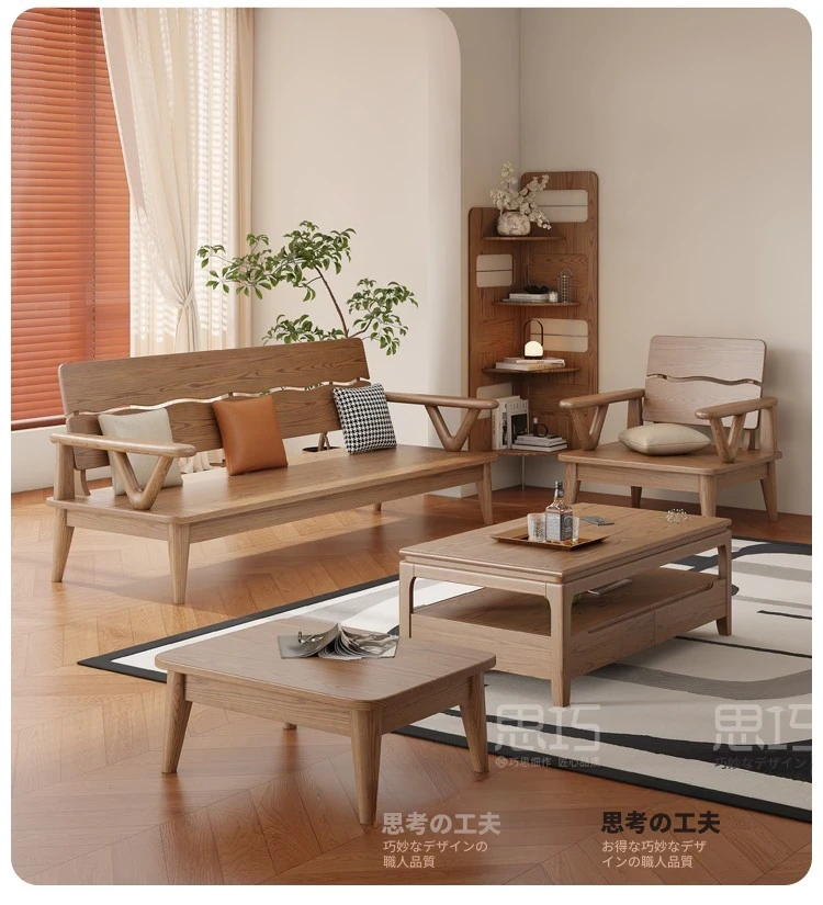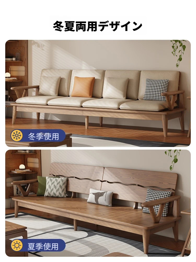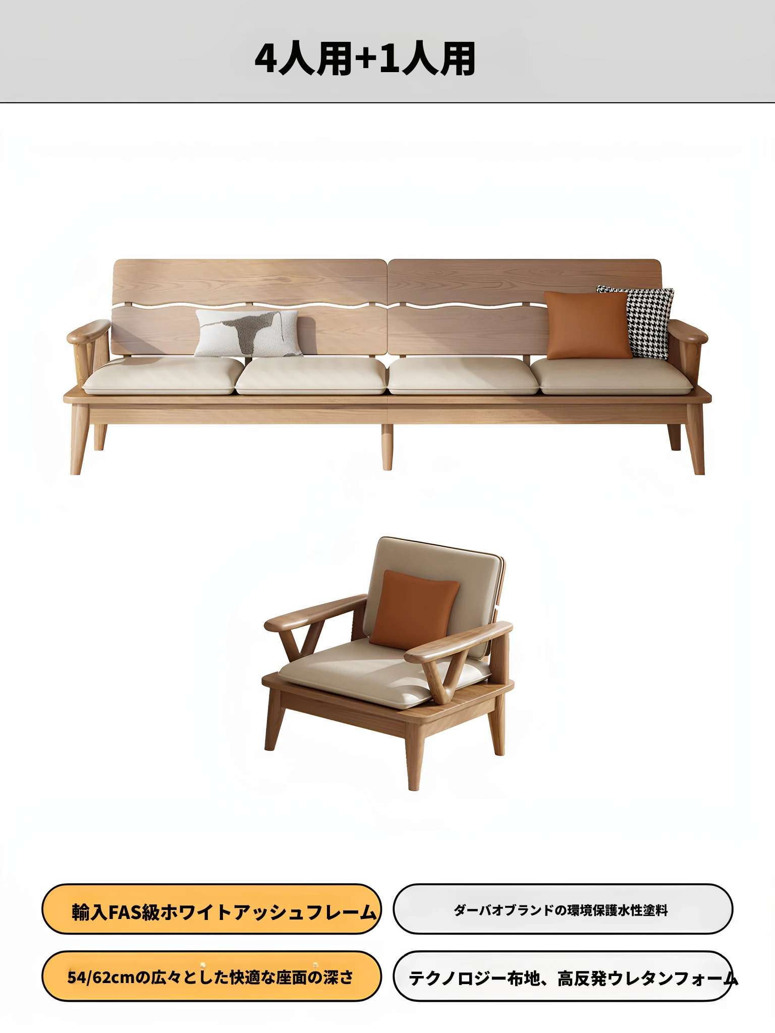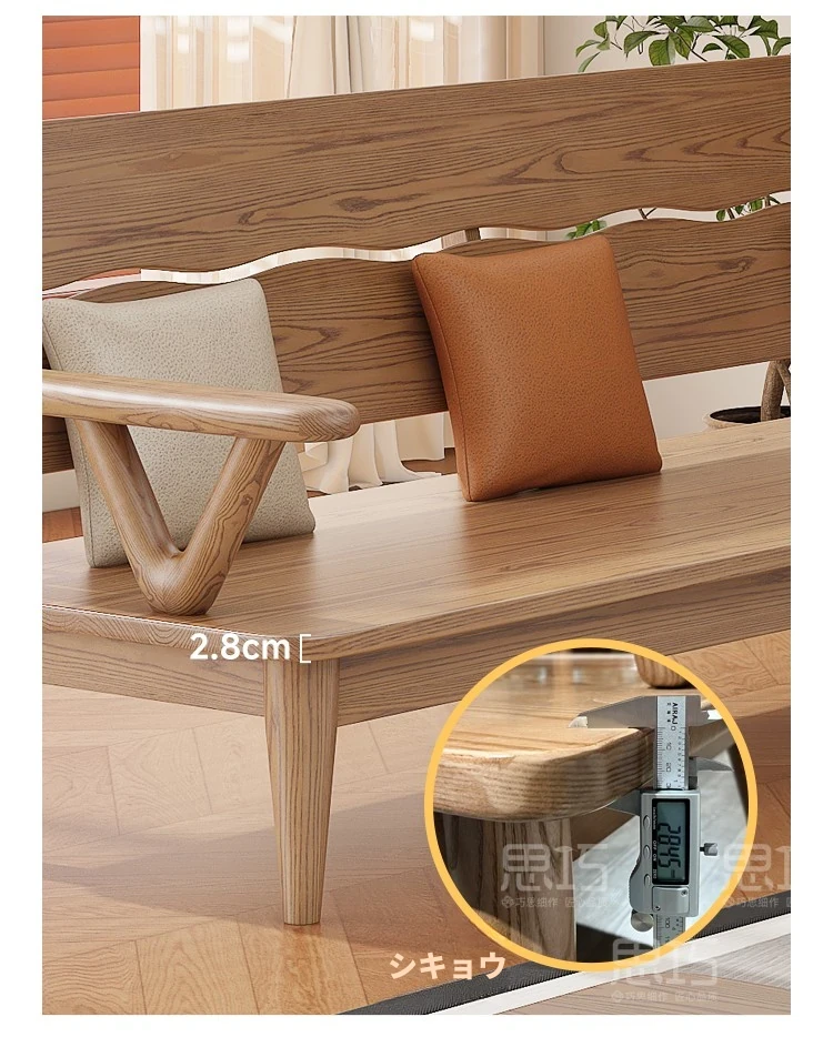 シンプルでモダンな無垢材ソファ - 新中式スタイルのリビングに最適!小型住宅向け、3人掛け・4人掛けのホワイトアッシュ無垢ソファ。洗練されたデザインで、居心地の良い空間を演出します。