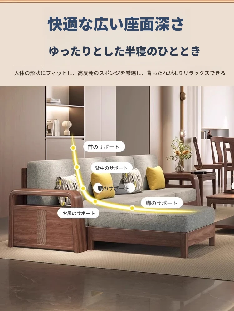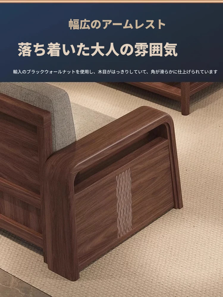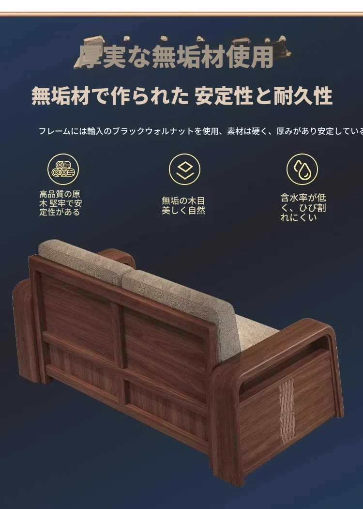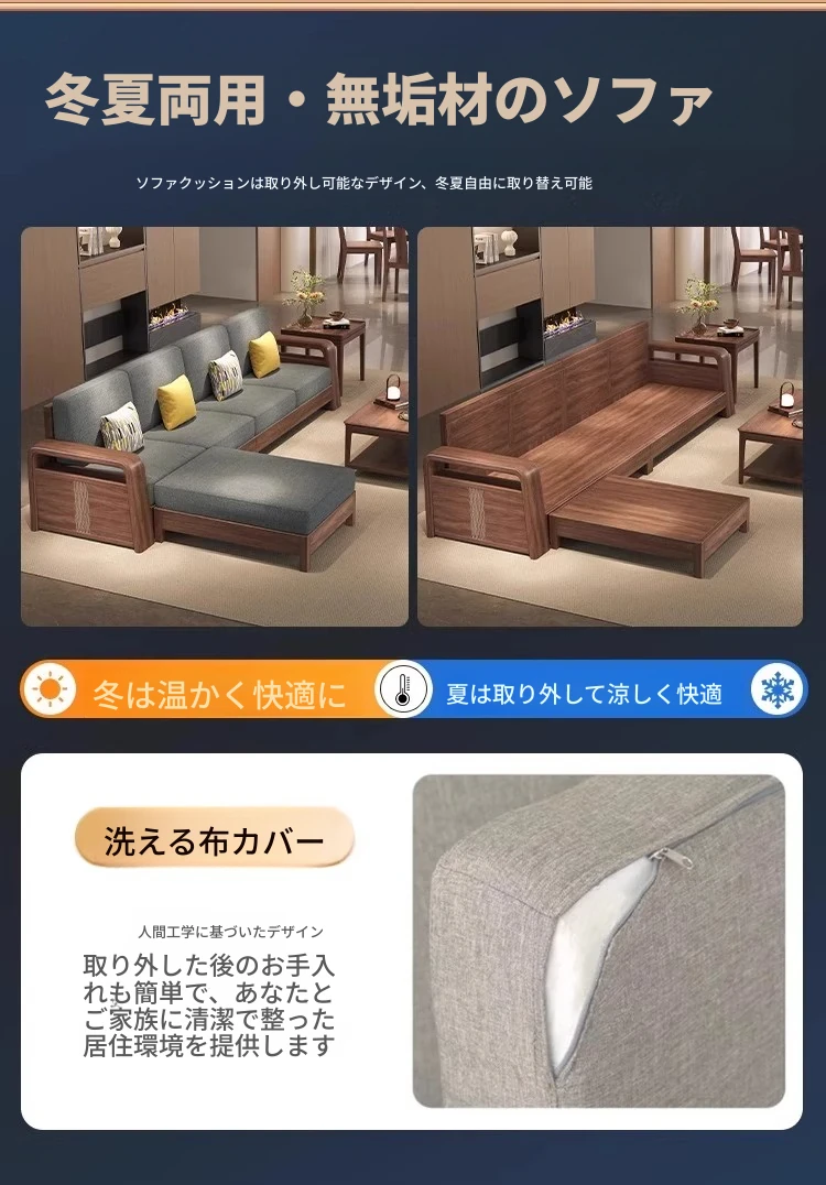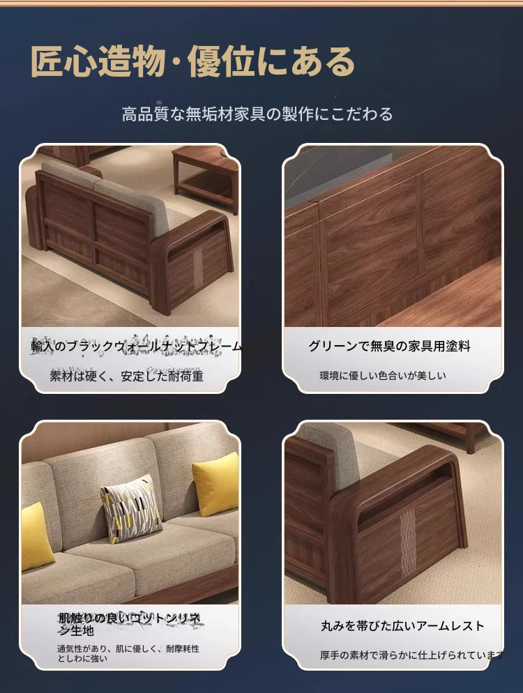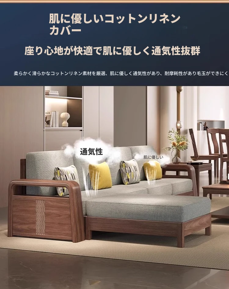 現代的シンプルなデザイン!ブラックウォールナット無垢材製のリビング用直線型コーナーソファ。冬夏兼用のファブリックソファで、収納スペースも完備。居心地の良い空間を演出します!