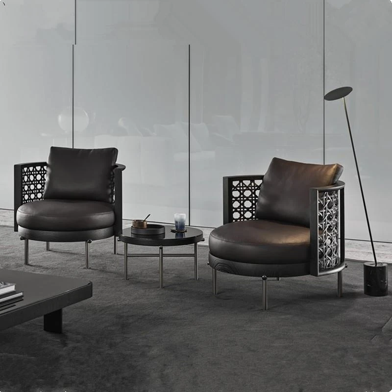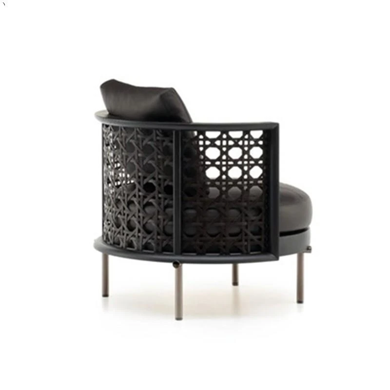 北欧スタイルの高級感あふれる無垢材ソファチェア|ホテル・クラブ・モデルルームに最適|リラックスできるラタン製の一人掛けソファ|お洒落な談話スペースにぴったり!