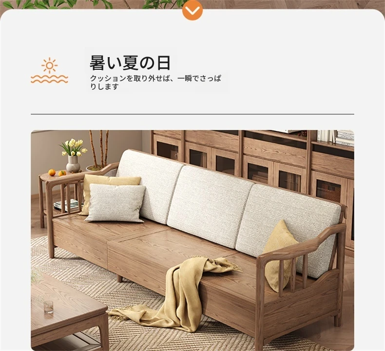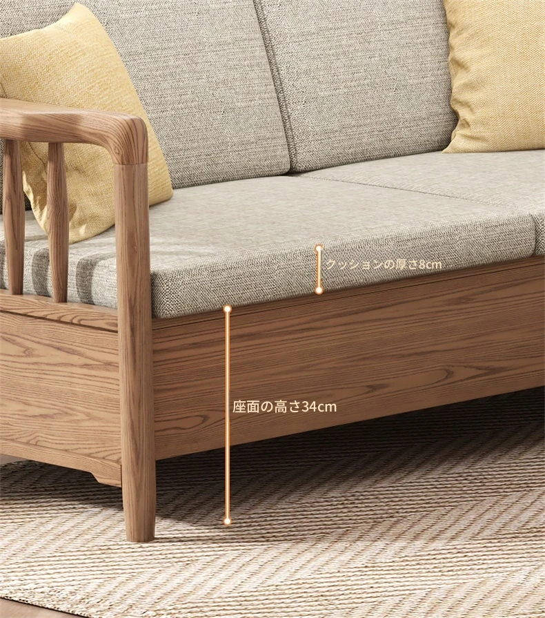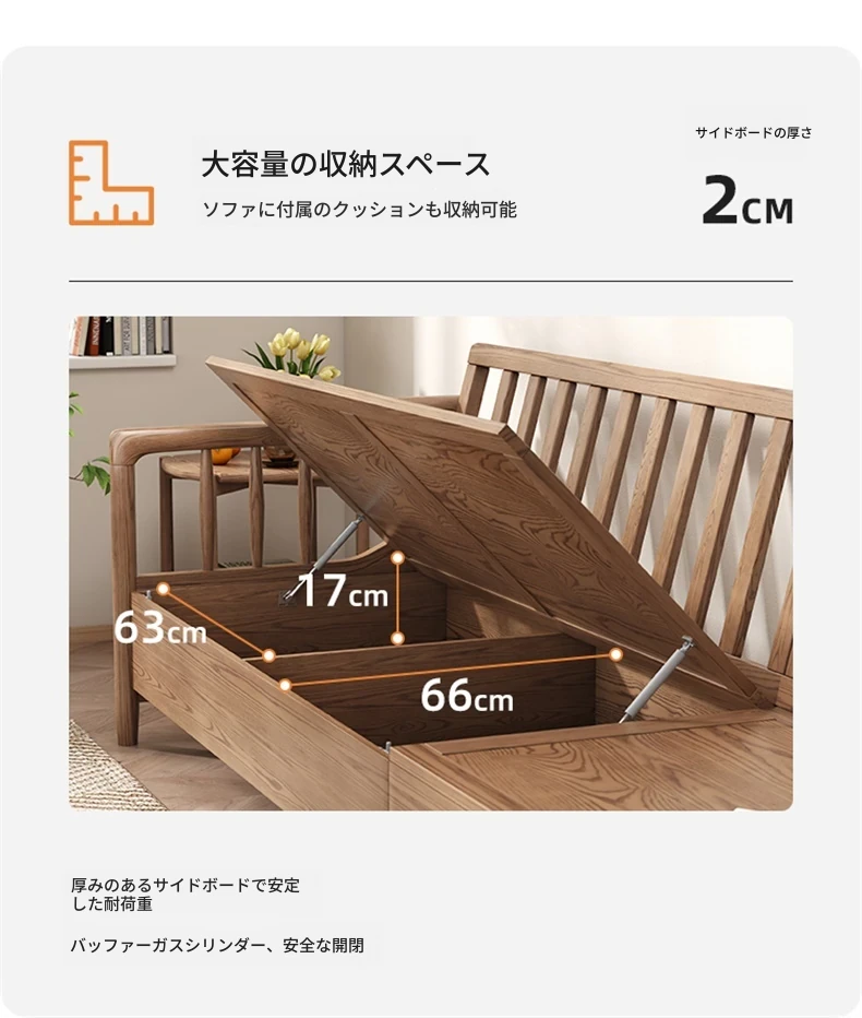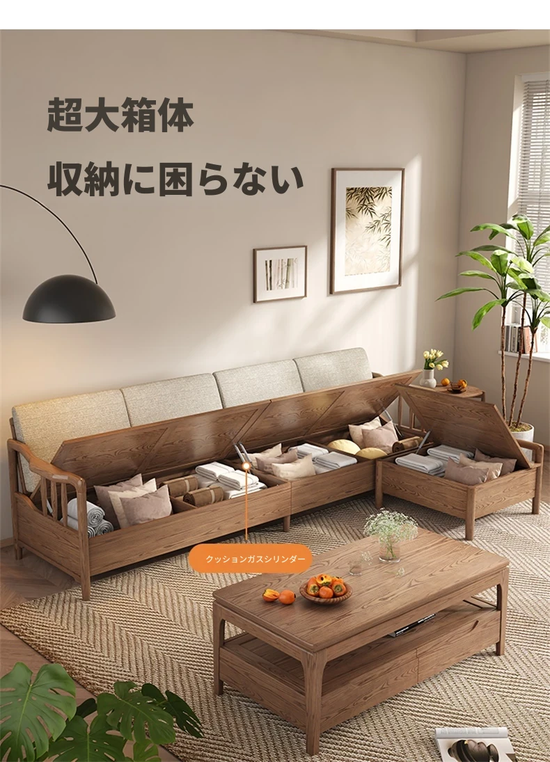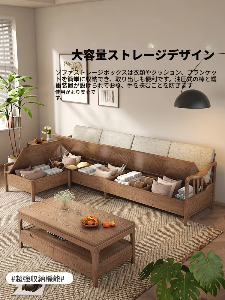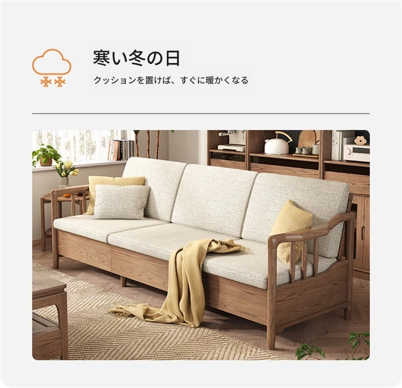 新中式デザインの実木ソファ、冬夏兼用!白アリの木を使用したコンパクトサイズの3人用ソファ。収納ボックス付きで、限られたスペースを有効活用。快適なリビング空間を実現します!