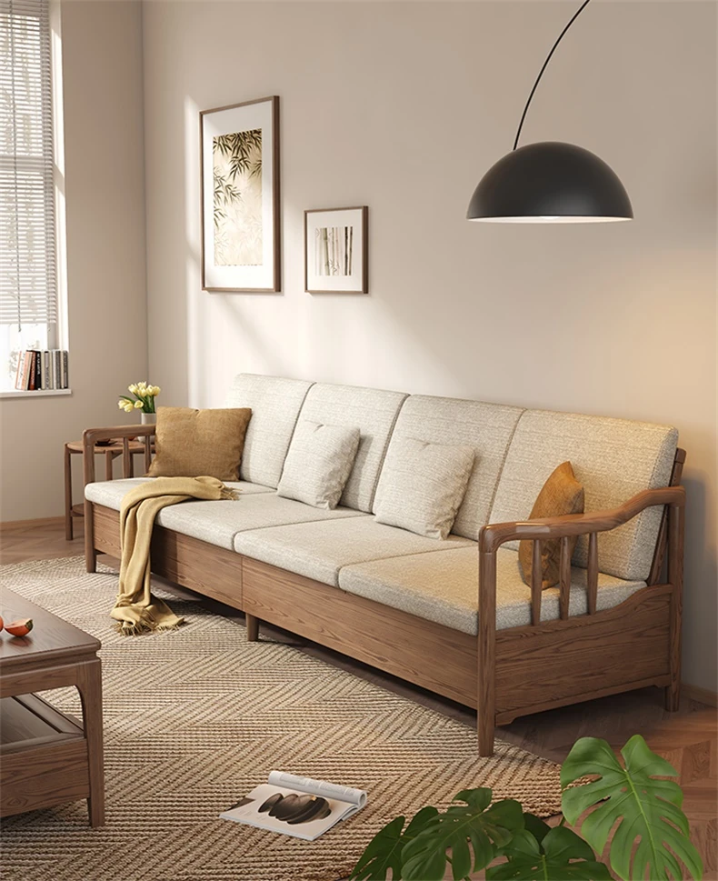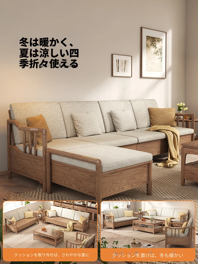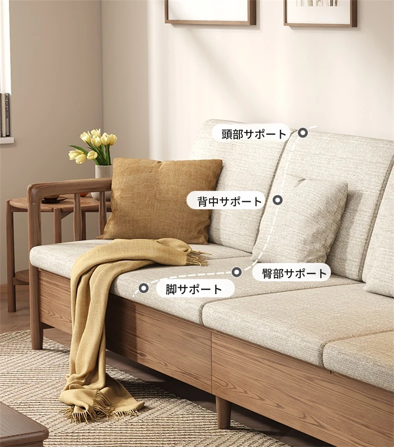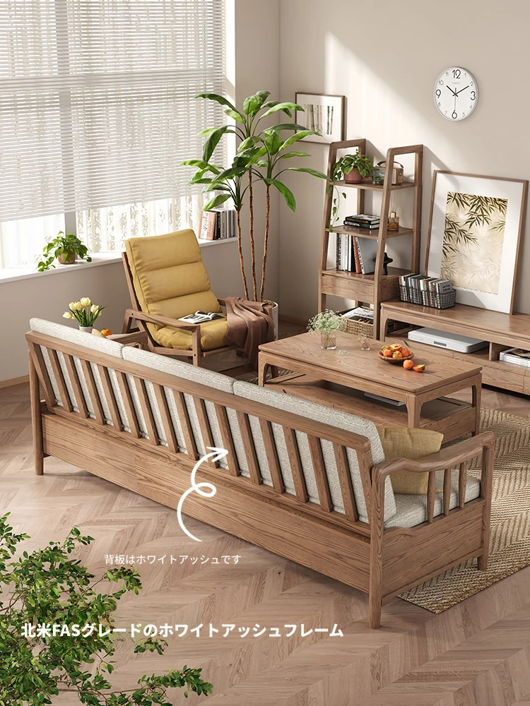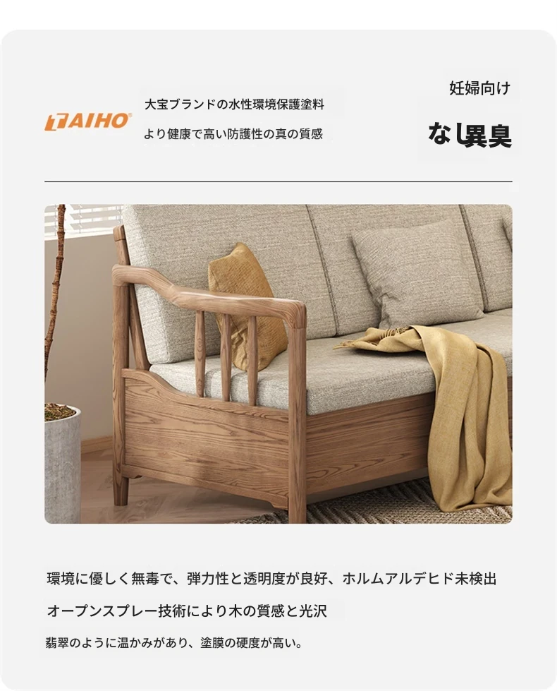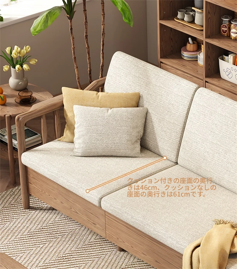 新中式デザインの実木ソファ、冬夏兼用!白アリの木を使用したコンパクトサイズの3人用ソファ。収納ボックス付きで、限られたスペースを有効活用。快適なリビング空間を実現します!