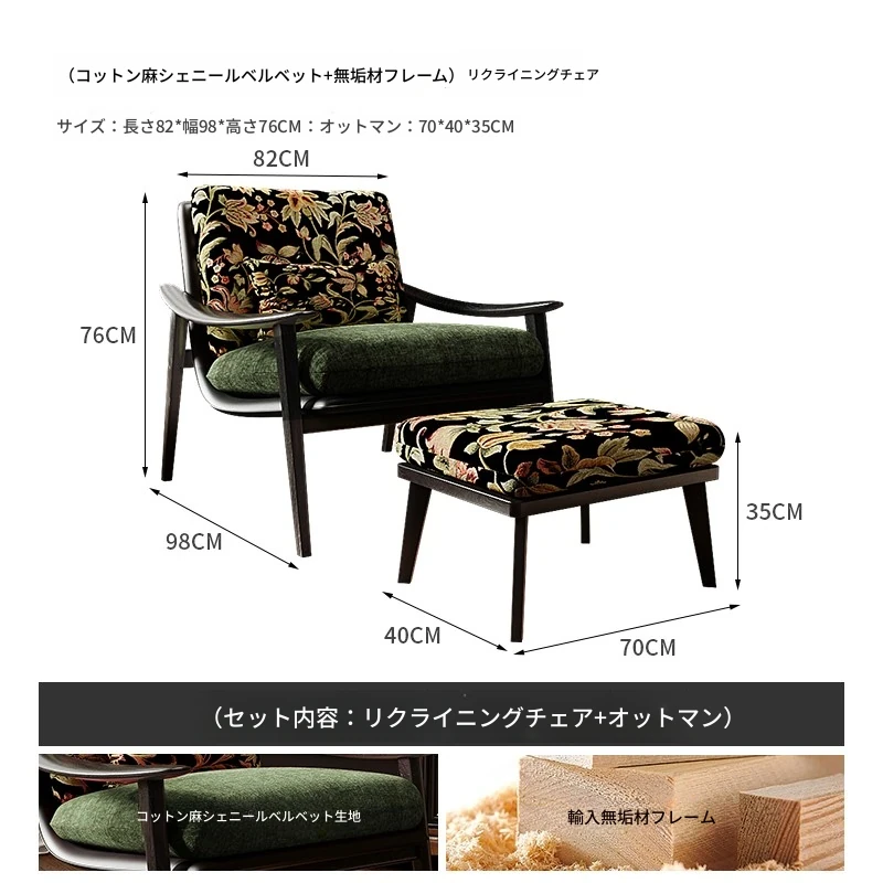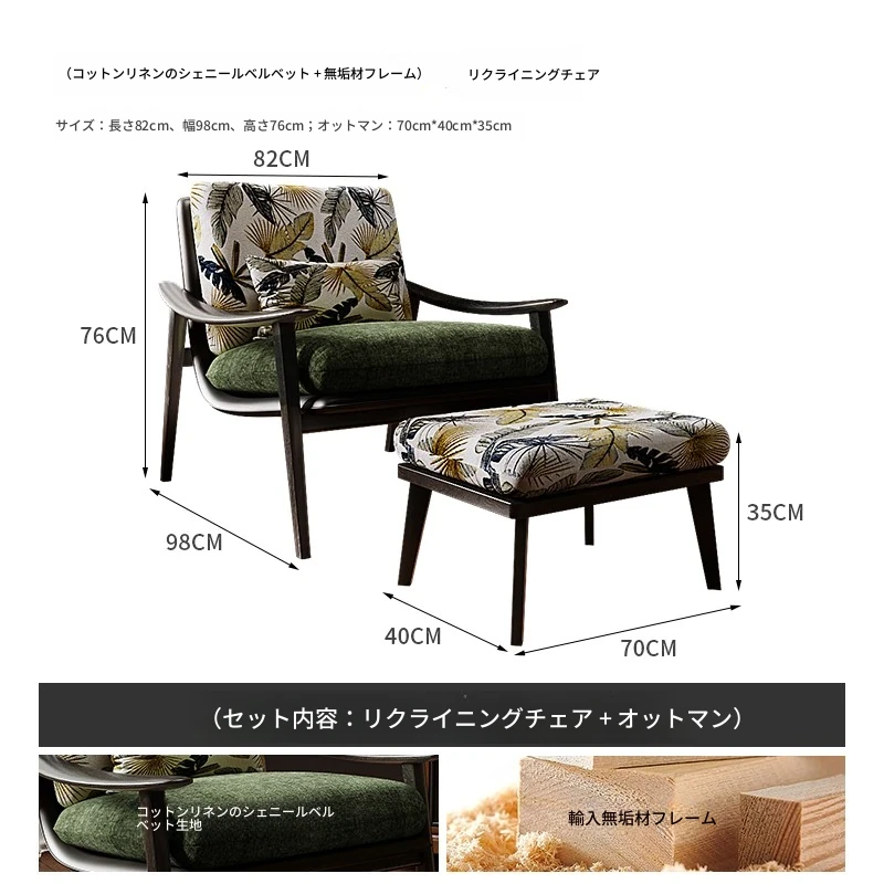 グリーンフラワーパッケージ:取り外し可能-ホワイトアッシュアームチェア+無垢材オットマン(同款クッション付き)