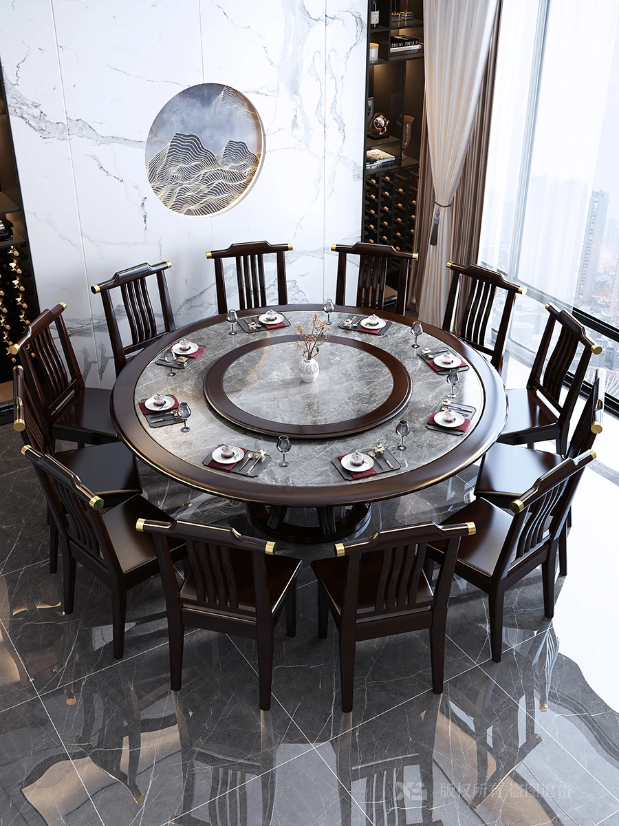 高品質天然木製の岩板ダイニングテーブルセット - 新中式スタイル、回転式サービングプレート付き、家庭用・レストラン用に最適な大きな円卓。電磁調理器や鍋料理にも対応!
