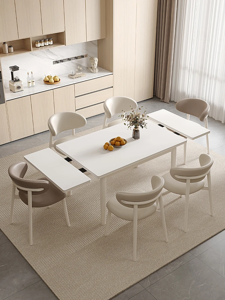クリーム風の真っ白マットなロックボードダイニングテーブル - 家庭用モダンシンプルな長方形デザイン、折りたたみ&伸縮可能でスペースを有効活用!