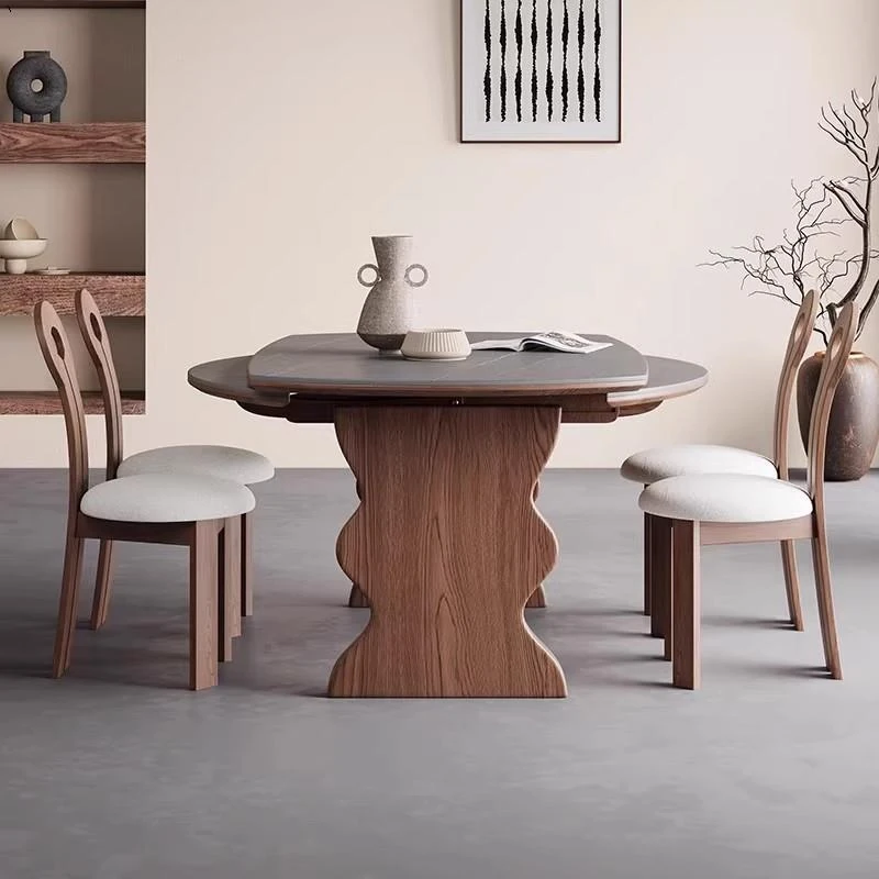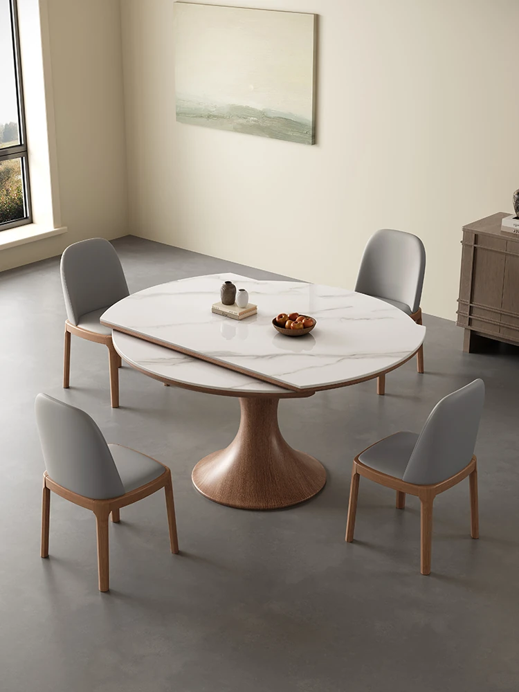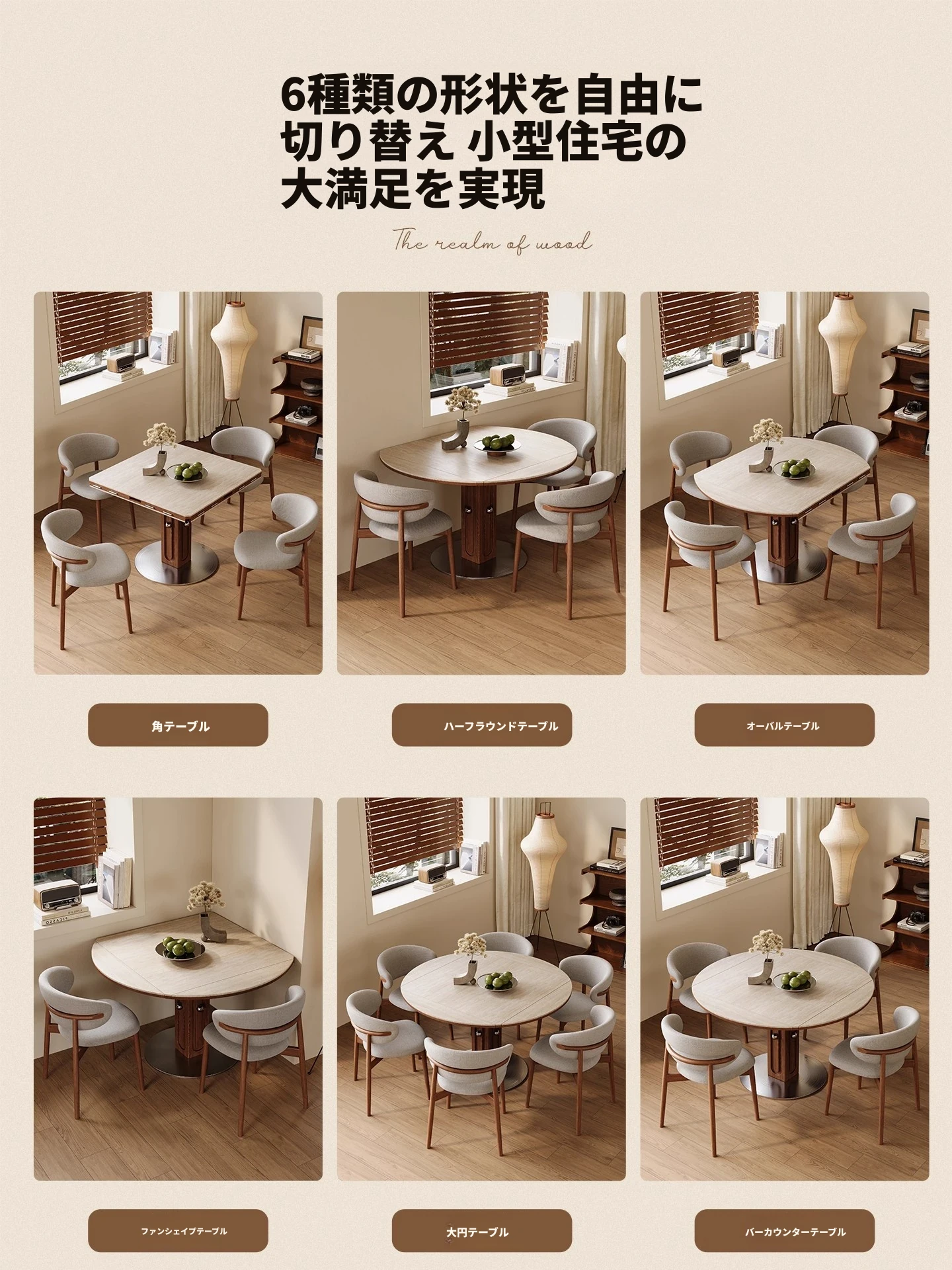 伸縮式岩板ダイニングテーブルセット - モダンでシンプルなデザイン、四角と円形の2WAY、コンパクトな家族向け、天然木製、レトロな雰囲気を楽しむ小型住宅に最適!