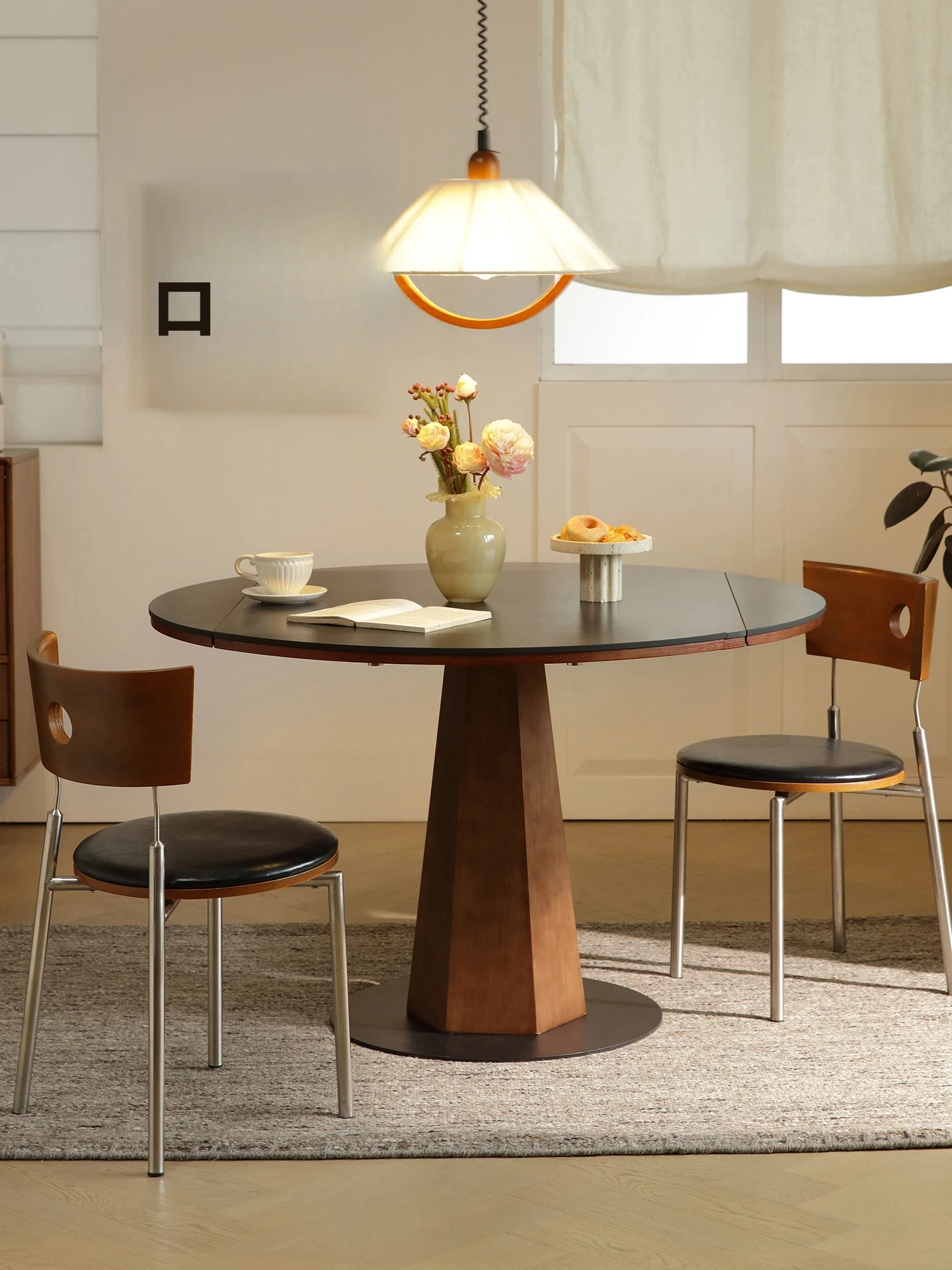 伸縮可能な実木製ロックボードダイニングテーブルセット|モダンなウォールナット色の円形デザイン|小さなスペースにも最適なシンプルでスタイリッシュな家庭用テーブル
