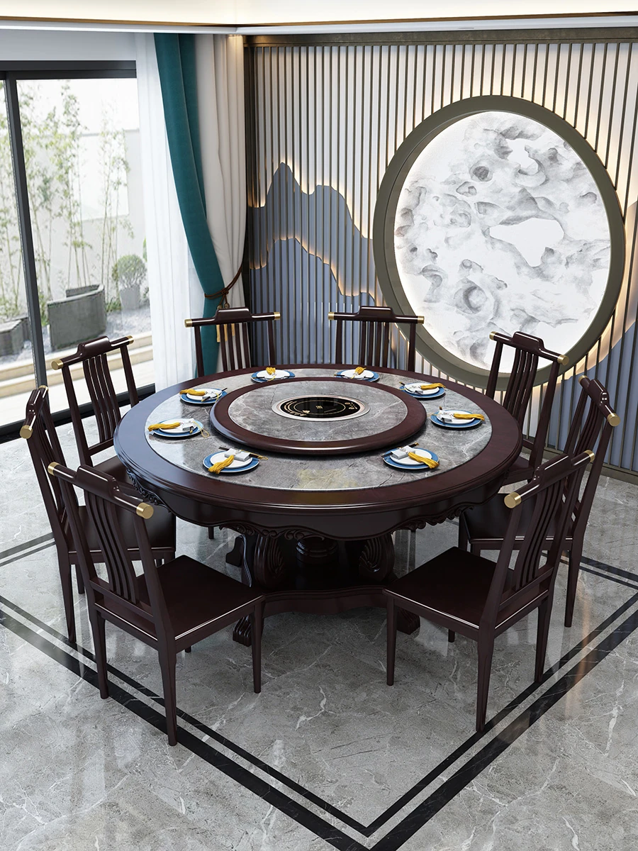 全実木製新中式岩板火鍋テーブル、電磁炉付き大理石円形ダイニングテーブル、家庭用、オーク材、回転トレー付き!おしゃれで機能的な食卓で、家族や友人との楽しいひとときを演出します。