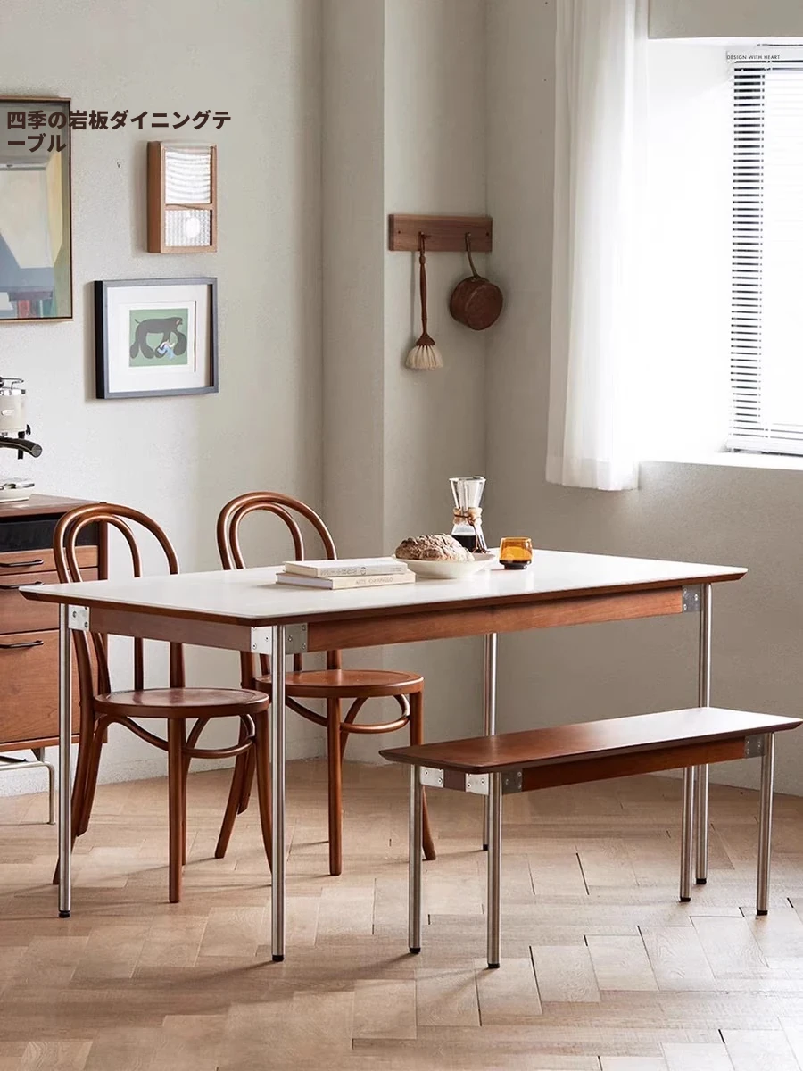 北欧レトロデザインの無垢材ロックプレートダイニングテーブル - 家庭用小型長方形テーブルとステンレス製のヴィンテージスタイルの椅子セット。おしゃれで機能的、狭いスペースでもぴったりフィット!