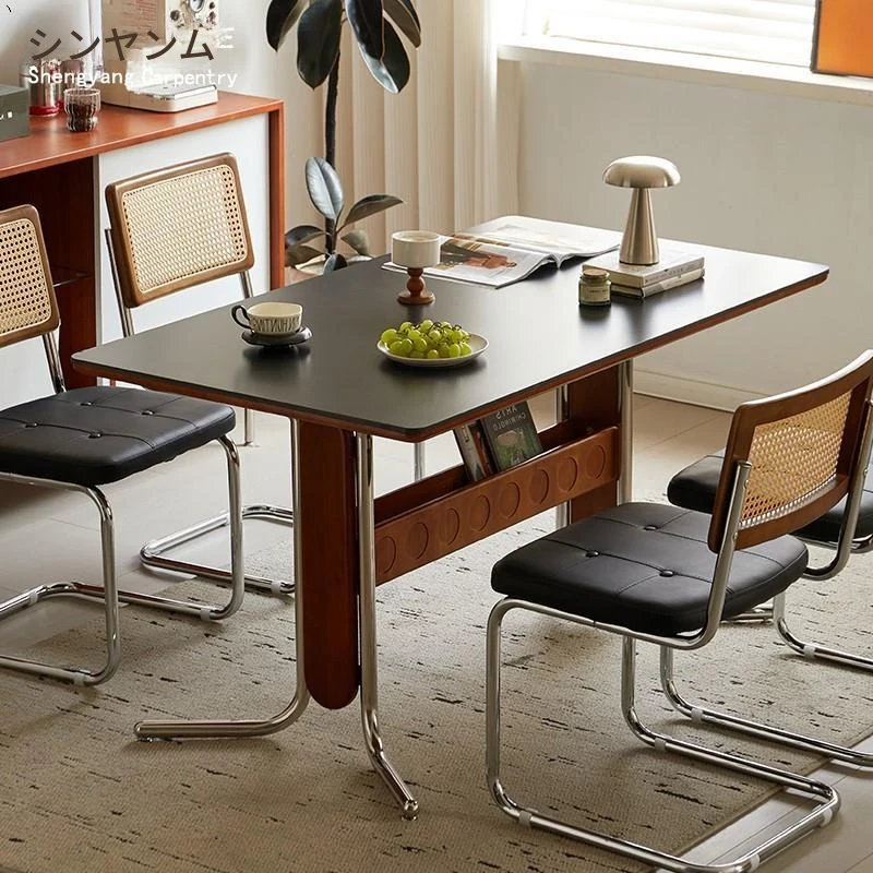 ヴィンテージ風ステンレス製岩板ダイニングテーブル&チェアセット - おしゃれなデザインの木製長方形テーブルで、家庭の食事を特別な時間に!