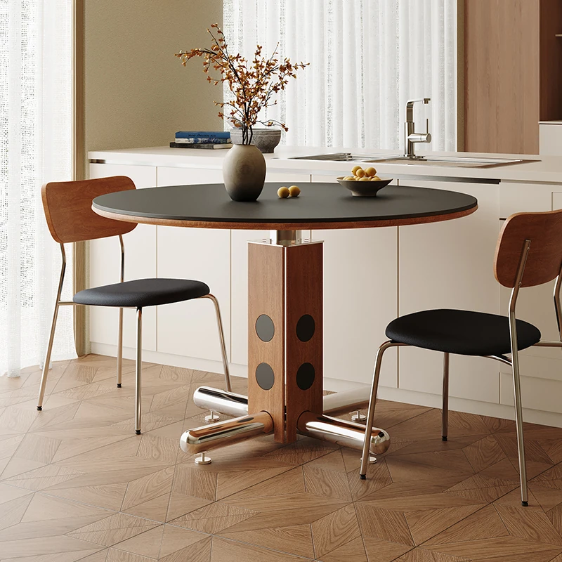 ヴィンテージ風デザインのステンレス製ラウンドテーブル - 小スペースに最適なクリエイティブな無垢材と岩板のダイニングテーブル、商談にもぴったり!