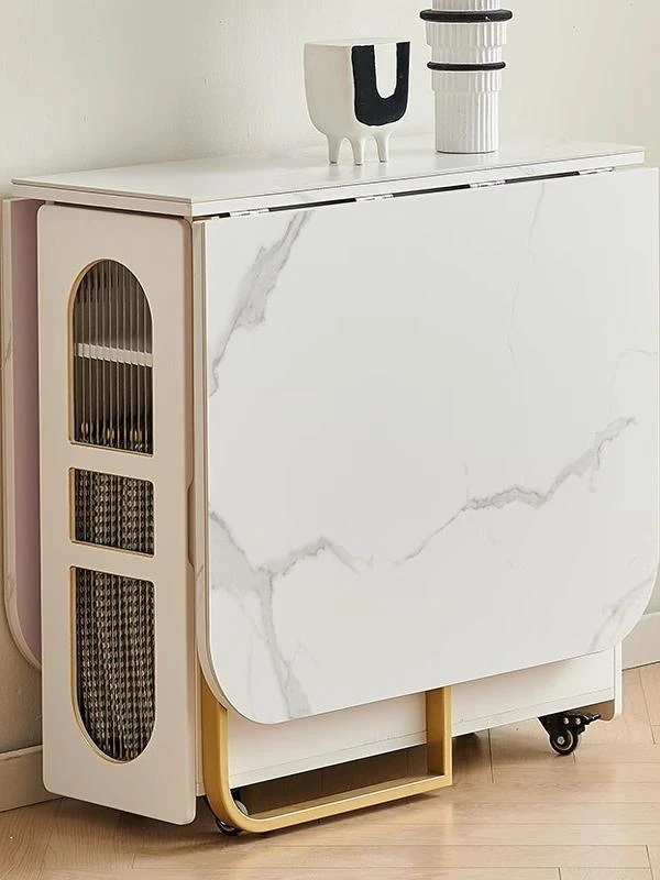 シンプルでモダンな折りたたみ式岩板ダイニングテーブル - スペースを有効活用できるコンパクトな長方形伸縮テーブル、少人数向けの軽やかでラグジュアリーな食卓。