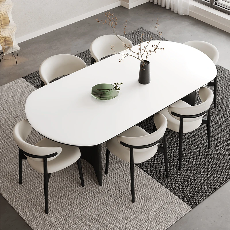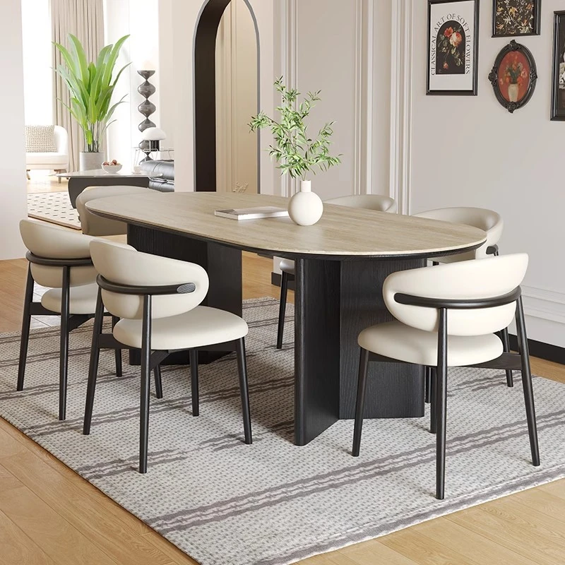 フランス産無垢材の洞石岩板ダイニングテーブル&チェアセット|ホワイトアッシュ製・ミッドセンチュリーの侘び寂びスタイル|心地よい楕円形デザインで、家庭に上品な雰囲気をプラス!
